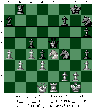 Last move : 0-1 2008 September 19 22:7:54 [Event "FICGS__CHESS__THEMATIC_TOURNAMENT__000045"] [Site "FICGS"] [Date "2008.02.28"] [Round "1"] [White "Tenorio,Elizabeth"] [Black "Paulesu,Sebastiano"] [Result "0-1"] [WhiteElo "1700"] [BlackElo "2067"] 1.e4 d5 2.exd5 Nf6 3.c4 e6 4.Nf3 exd5 5.b3 d4 6.d3 Bb4+ 7.Bd2 Na6 8.Be2 O-O 9.O-O Re8 10.Re1 c5 11.a3 Bxd2 12.Nbxd2 Qd6 13.Ng5 Bf5 14.Qc2 h6 15.Ngf3 Nc7 16.Nh4 Bh7 17.Rab1 Qa6 18.a4 Qd6 19.Bf3 Rxe1+ 20.Rxe1 g5 21.Bxb7 Rb8 22.Be4 gxh4 23.Bxh7+ Nxh7 24.h3 Ne6 25.Ne4 Qe5 26.Qd1 Nf4 0-1 This chess game has been lost on time (started : 2008.02.28 15:31:43) Scandinavian : Icelandic gambit Kingside Castling by player Black (move 8) Kingside Castling by player White (move 9) Player Black won this chess game. Follow this game move after move (download)I give 98 percent of my mental energy to Chess. Others give only 2 percent. (Bobby Fischer) Gegen einen Schachcomputer zu verlieren ist wie Löcher in den Strümpfen zuhaben. Es ist nicht peinlich, solange man der einzige ist der es weiß. (Anonymous) Tu no necesitas jugar muy bien, únicamente ayudar a tu oponenet a que juegue muy mal. (Genrikh Chepukaitis) Plusieurs personnes se sont demandées comment Tal faisait pour gagner... En fait, c'est très simple ! Il met ses pièces au centre de l'échiquier et les sacrifie quelque part ! (David Bronstein) The leaves of memory seemed to make a mournful rustling in the dark. (Henry Wadsworth Longfellow)