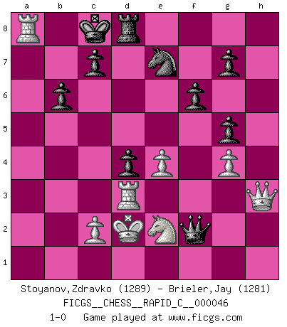 Last move : 1-0 2008 March 19 22:1:7 [Event "FICGS__CHESS__RAPID_C__000046"] [Site "FICGS"] [Date "2008.02.29"] [Round "1"] [White "Stoyanov,Zdravko"] [Black "Brieler,Jay"] [Result "1-0"] [WhiteElo "1289"] [BlackElo "1281"] 1.e4 e5 2.Nf3 Nc6 3.Bb5 a6 4.Bxc6 dxc6 5.d3 Bg4 6.h3 Bh5 7.Be3 Qd7 8.g4 Bg6 9.Nxe5 Qe6 10.Nxg6 hxg6 11.Nc3 O-O-O 12.Qf3 Bd6 13.Bd4 f6 14.O-O-O Bb4 15.Ne2 Qxa2 16.Bc3 Qa1+ 17.Kd2 Bxc3+ 18.Nxc3 Qxb2 19.Ra1 Qb4 20.Rhb1 Qd6 21.Ne2 Ne7 22.Rb3 g5 23.Qe3 c5 24.Rc3 Qe5 25.R1a3 b6 26.Rxa6 Qh2 27.d4 Rxh3 28.Qxh3 Qxf2 29.Rd3 cxd4 30.Ra8+ 1-0 Ruy Lopez : Exchange variation Queenside Castling by player Black (move 11) Queenside Castling by player White (move 14) Player White won this chess game. Follow this game move after move (download)If your opponent cannot do anything active, then don't rush the position; instead you should let him sit there, suffer, and beg you for a draw. (Jeremy Silman) Die Elozahlen sind sehr schlecht für das Schach. Jetzt ist Schach eine Sportindustrie, die darauf zielt Elopunkte zu machen. (Miguel Najdorf) El estómago es una parte esencial del maestro de Ajedrez. (Bent Larsen) Pour se monter efficace, un Cavalier a besoin d'avant-postes ! Les Cavaliers font les meilleurs bloqueurs de pions passés. Luck never gives; it only lends. (Swedish proverb)