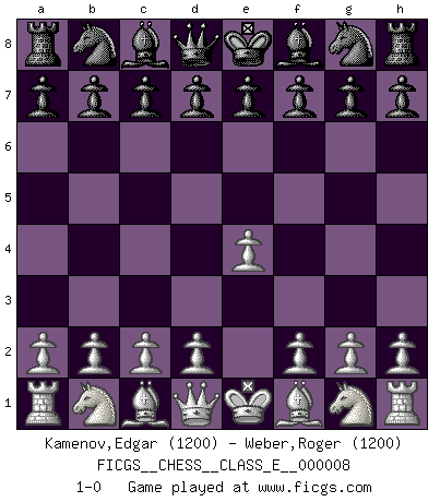 Last move : 1-0 2006 August 15 21:13:39 [Event "FICGS__CHESS__CLASS_E__000008"] [Site "FICGS"] [Date "2006.07.06"] [Round "1"] [White "Kamenov,Edgar"] [Black "Weber,Roger"] [Result "1-0"] [WhiteElo "1200"] [BlackElo "1200"] 1.e4 1-0 King's pawn Opening Player White won this chess game. Follow this game move after move (download)The beauty of a move lies not in its' appearance but in the thought behind it. (Siegbert Tarrasch) Ich glaube, ich kenne inzwischen die Gründe für mein Versagen: schachliche Charakterfehler. Ich war nie ein Wunderkind und in meiner gesamten menschlichen Entwicklung immer zu langsam. (Viktor Kortschnoi) Fischer es el jugador mas fuerte del mundo. De hecho, el jugador mas fuerte que jamas haya existido. (Larry Evans) Le profane ne songe pas à la somme de jouissance dont il se prive, qui méconnaît ce jeu aux ressources aussi variées que passionnantes. (Jean-Marie Jeanton-Lamarche) Man is reluctant to give credit for intelligence to anyone, except his enemies. (Albert Einstein)