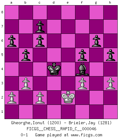 Last move : 0-1 2008 April 8 20:43:33 [Event "FICGS__CHESS__RAPID_C__000046"] [Site "FICGS"] [Date "2008.02.29"] [Round "1"] [White "Gheorghe,Ionut"] [Black "Brieler,Jay"] [Result "0-1"] [WhiteElo "1200"] [BlackElo "1281"] 1.e4 e5 2.Nf3 Nc6 3.Bb5 a6 4.Ba4 Nf6 5.O-O Nxe4 6.Re1 Nc5 7.Bxc6 dxc6 8.Nxe5 Be6 9.Qh5 g6 10.Qf3 Qe7 11.Nc3 Bg7 12.d4 Nd7 13.Nxd7 Qxd7 14.Bg5 O-O 15.Rad1 Bg4 16.Qd3 Bxd1 17.Qxd1 Bxd4 18.Ne2 Rfe8 19.Be3 Rxe3 20.fxe3 Bxe3+ 21.Kf1 Qf5+ 22.Nf4 Qxf4+ 23.Qf3 Qxf3+ 24.gxf3 Bf4 25.Kg2 Rd8 26.Re2 Rd2 27.Rxd2 Bxd2 28.b3 b5 29.h3 Bf4 30.Kf2 f5 31.Ke2 Kf7 32.Kd3 Ke6 33.Ke2 h5 34.Kf2 Kd5 35.Ke2 Kd4 0-1 Ruy Lopez : Open (Tarrasch) defense Kingside Castling by player White (move 5) Kingside Castling by player Black (move 14) Player Black won this chess game. Follow this game move after move (download)My God, Bobby Fischer plays so simply. (Alexei Suetin) Um dein Spiel zu verbessern musst du zuallererst das Endspiel studieren, denn diese kann unabhängig studiert werden. Die Eröffnung und das Mittelspiel müssen immer in Bezug gesetzt werden zum Endspiel. (José Raúl Capablanca) El Ajedrez lo es todo: arte, ciencia y deporte. (Anatoly Karpov) La tactique est l'élément le plus important du milieu de jeu. (Siegbert Tarrasch) I don't know, I don't care, and it doesn't make any difference. (Albert Einstein)