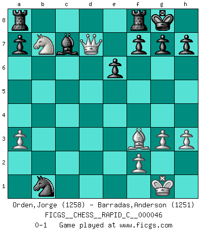 Last move : 0-1 2008 May 4 21:8:33 [Event "FICGS__CHESS__RAPID_C__000046"] [Site "FICGS"] [Date "2008.02.29"] [Round "1"] [White "Orden,Jorge"] [Black "Barradas,Anderson"] [Result "0-1"] [WhiteElo "1258"] [BlackElo "1251"] 1.e4 c6 2.Nf3 d5 3.exd5 cxd5 4.d4 Bg4 5.Be2 Nc6 6.h3 Bxf3 7.Bxf3 Nf6 8.Bg5 e6 9.O-O Be7 10.a3 O-O 11.b3 Qb6 12.Be3 Bd6 13.c4 dxc4 14.bxc4 Qb2 15.Nd2 Nxd4 16.Bxd4 Qxd4 17.Nb3 Qf4 18.g3 Qxc4 19.Na5 Qb5 20.Nxb7 Bc7 21.Rb1 Qe5 22.Re1 Qc3 23.Re3 Ne4 24.Rxc3 Nxc3 25.Qd7 Nxb1 0-1 This chess game has been lost on time (started : 2008.02.29 15:39:55) Caro-Kann defense Kingside Castling by player White (move 9) Kingside Castling by player Black (move 10) Player Black won this chess game. Follow this game move after move (download)I played Chess with him and would have beaten him sometimes only he always took back his last move, and ran the game out differently. (Mark Twain) Gewöhnliche Menschen denken nur daran, wie sie ihre Zeit verbringen. Ein intelligenter Mensch versucht, sie auszunutzen. (Arthur Schopenhauer) En un gambito tu regalas un Peón por el bién de tomar un juego perdido. (Samuel Standige Boden) Ne tendez aucun piège pour le plaisir ! Ne jouez rien dans l'espoir que l'adversaire réagisse de façon stupide ! Prenez toujours pour acquis que l'adversaire va trouver le meilleur coup ! Ne jouez jamais de coup dans l'espoir que l'adversaire ne voie pas la menace ! Chacun de vos coups doit améliorer la position d'une façon ou d'une autre. A good aphorism is too hard for the tooth of time, and is not worn away with the centuries, although it serves as food for every speech. (Friedrich Nietzsche)