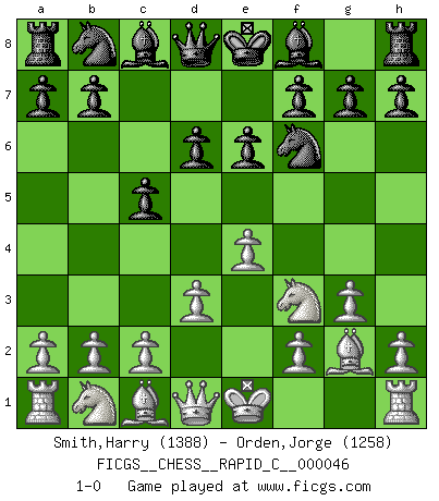 Last move : 1-0 2008 May 3 9:6:53 [Event "FICGS__CHESS__RAPID_C__000046"] [Site "FICGS"] [Date "2008.02.29"] [Round "1"] [White "Smith,Harry"] [Black "Orden,Jorge"] [Result "1-0"] [WhiteElo "1388"] [BlackElo "1258"] 1.e4 c5 2.Nf3 d6 3.g3 Nf6 4.d3 e6 5.Bg2 1-0 This chess game has been lost on time (started : 2008.02.29 15:39:55) Sicilian Player White won this chess game. Follow this game move after move (download)At this time Fischer is simply a level above all the best Chessplayers in the world. (John Jacobs) Im Schach gibt es keinen Platz für Galanterie. (Irving Chernev) Botvinnik trataba de restarle el misterio al Ajedrez, siempre relacionandolo a situaciones de la vida ordinaria. El gustaba de llamar al Ajedrez un típico problema inexacto similar a aquellos de los cuales la gente siempre tiene que enfrentarse en la vida cotidiana. (Garry Kasparov) La solitude du joueur d'Echecs à l'approche du mat est semblable à celle du condamné. (Francis Szpiner) For to win one hundred victories in one hundred battles is not the acme of skill. To subdue the enemy without fighting is the acme of skill. (Sun Tzu)