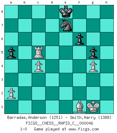 Last move : 1-0 2008 June 30 13:54:43 [Event "FICGS__CHESS__RAPID_C__000046"] [Site "FICGS"] [Date "2008.02.29"] [Round "1"] [White "Barradas,Anderson"] [Black "Smith,Harry"] [Result "1-0"] [WhiteElo "1251"] [BlackElo "1388"] 1.e4 e6 2.d4 d5 3.Nc3 Nf6 4.Bg5 Be7 5.exd5 Nxd5 6.Bxe7 Qxe7 7.Nxd5 exd5 8.Qe2 Qxe2+ 9.Bxe2 Nc6 10.Nf3 O-O 11.O-O Bg4 12.c3 Ne7 13.b3 Rac8 14.h3 Bh5 15.g4 Bg6 16.Ne5 Rcd8 17.Rad1 c6 18.f4 b6 19.f5 f6 20.fxg6 hxg6 21.Nf3 g5 22.h4 gxh4 23.Nxh4 c5 24.dxc5 bxc5 25.c4 dxc4 26.bxc4 Rxd1 27.Rxd1 g5 28.Nf5 Nc6 29.Rd7 Re8 30.Nh6+ Kh8 31.Bf1 a5 32.Nf7+ Kg7 33.Rc7 Ne7 34.Nd6 Kf8 35.Nxe8 Kxe8 36.Rxc5 1-0 This chess game has been lost on time (started : 2008.02.29 15:39:55) French : Classical Kingside Castling by player Black (move 10) Kingside Castling by player White (move 11) Player White won this chess game. Follow this game move after move (download)There is no remorse like the remorse of Chess. (H. G. Wells) Spielt Blackmar-Diemer-Gambit, und das Matt kommt von selbst! (Emil Joseph Diemer) Observen a Garry Kasparov. Después de una derrota, invariablemente el gana la próxima partida. Prácticamente hace pedazos a su siguiente oponente. Eso es algo que tenemos que aprender a lograr. (Maurice Ashley) Toute estimation doit être constamment réévaluée. (Jacob Estrin) The man who strikes first admits that his ideas have given out. (Chinese proverb)