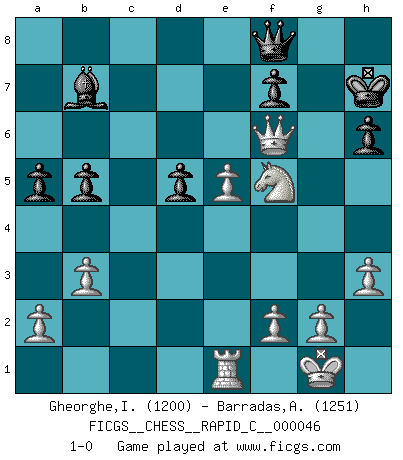 Last move : 1-0 2008 March 6 21:22:14 [Event "FICGS__CHESS__RAPID_C__000046"] [Site "FICGS"] [Date "2008.02.29"] [Round "1"] [White "Gheorghe,Ionut"] [Black "Barradas,Anderson"] [Result "1-0"] [WhiteElo "1200"] [BlackElo "1251"] 1.e4 e5 2.Nf3 Nc6 3.Bb5 a6 4.Ba4 b5 5.Bb3 Nf6 6.O-O Bc5 7.c3 O-O 8.d4 exd4 9.cxd4 Bb6 10.Nc3 d6 11.h3 Re8 12.Re1 a5 13.Bg5 h6 14.Bh4 Qd7 15.Bxf6 gxf6 16.Nh4 Nxd4 17.Nd5 Qe6 18.Nxb6 Nxb3 19.Nxa8 Nxa1 20.Nxc7 Qe5 21.Nxe8 Qxe8 22.Qxa1 Bb7 23.Nf5 Qf8 24.b3 Kh7 25.Qxf6 d5 26.e5 1-0 Ruy Lopez : Caro variation Kingside Castling by player White (move 6) Kingside Castling by player Black (move 7) Player White won this chess game. Follow this game move after move (download)He who takes the Queen's Knight's Pawn will sleep in the streets. (Anonymous) Besser ein falscher Plan, logisch durchgeführt, als gar kein Plan. (Viktor Kortschnoi) Es muy difícil jugar en contra de la teoría de Einstein. - en su primera derrota en contra de Fischer (Mikhail Tal) Il (Jacob Murray) ne joue pas pour le bon coup, mais pour le meilleur. (Eloi Relange) It is not titles that honor men, but men that honor titles. (Niccolo Machiavelli)