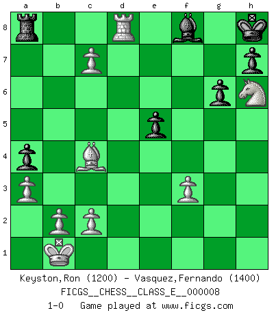 Last move : 1-0 2006 November 12 10:18:24 [Event "FICGS__CHESS__CLASS_E__000008"] [Site "FICGS"] [Date "2006.07.06"] [Round "1"] [White "Keyston,Ron"] [Black "Vasquez,Fernando"] [Result "1-0"] [WhiteElo "1200"] [BlackElo "1400"] 1.e4 e5 2.Nf3 d6 3.d4 exd4 4.Nxd4 Nf6 5.Nc3 Be7 6.Bf4 O-O 7.Qd2 Nc6 8.O-O-O Nxd4 9.Qxd4 Be6 10.f3 Nd7 11.Qe3 Bf6 12.g4 a5 13.Kb1 Be5 14.Bg3 Re8 15.Nb5 Bf6 16.Qf2 a4 17.a3 Qc8 18.h4 Be7 19.g5 Nc5 20.h5 Bxg5 21.h6 g6 22.e5 Na6 23.exd6 Qd8 24.Qd4 Bf6 25.dxc7 Qe7 26.Qb6 Rec8 27.Rh2 Qc5 28.Qxb7 Be7 29.Rhd2 Qg5 30.Na7 Nc5 31.Qxc8+ Bxc8 32.Rd8+ Bf8 33.Nxc8 Ne6 34.Bc4 Qxh6 35.Ne7+ Kg7 36.Be5+ f6 37.Ng8 fxe5 38.R1d7+ Kh8 39.Nxh6 Nxd8 40.Rxd8 1-0 Philidor : Exchange variation Kingside Castling by player Black (move 6) Queenside Castling by player White (move 8) Player White won this chess game. Follow this game move after move (download)Chess is no whit inferior to the violin, and we have a large number of professional violinists. (Mikhail Botvinnik) Schach verlangt totale Konzentration. (Robert James Fischer) Tu sabes que vas a perder. Aún cuando tenía la ventaja, yo sabía que iba a perder. - al estar jugando con Fischer (Andrew Soltis) Ne tendez aucun piège pour le plaisir ! Ne jouez rien dans l'espoir que l'adversaire réagisse de façon stupide ! Prenez toujours pour acquis que l'adversaire va trouver le meilleur coup ! Ne jouez jamais de coup dans l'espoir que l'adversaire ne voie pas la menace ! Chacun de vos coups doit améliorer la position d'une façon ou d'une autre. You must have a dream in order to have it come true. (A.P.J. Kalam)