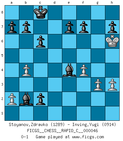 Last move : 0-1 2008 March 23 21:1:56 [Event "FICGS__CHESS__RAPID_C__000046"] [Site "FICGS"] [Date "2008.02.29"] [Round "1"] [White "Stoyanov,Zdravko"] [Black "Inving,Yugi"] [Result "0-1"] [WhiteElo "1289"] [BlackElo "0914"] 1.e4 c5 2.Nf3 Nc6 3.Bb5 g6 4.Bxc6 dxc6 5.h3 Nf6 6.d3 Bg7 7.c3 Be6 8.Ng5 Qd6 9.Nf3 Nd7 10.O-O O-O-O 11.Re1 Ne5 12.Bf4 Nxf3+ 13.Qxf3 Qxd3 14.Nd2 Rd7 15.Rad1 Rhd8 16.Re3 Qc2 17.R3e1 Rxd2 18.Bxd2 Rxd2 19.Rxd2 Qxd2 20.Re2 Qd1+ 21.Kh2 Be5+ 22.g3 Bc4 23.Re3 Qc2 24.b3 Be6 25.Re2 Qxc3 26.Re3 Qb2 27.Re2 Qc1 28.Qd3 c4 29.Qd2 Qxd2 30.Rxd2 c3 31.Rc2 g5 32.Kg2 Bd4 33.b4 Bc4 34.Kf3 Bd3 35.Rc1 c2 36.Kg4 Bb2 37.Kxg5 Bxc1+ 38.f4 Bxe4 39.Kh6 Bb2 0-1 Sicilian : Nimzovich-Rossolimo attack (with ...g6, without ...d6) Kingside Castling by player White (move 10) Queenside Castling by player Black (move 10) Player Black won this chess game. Follow this game move after move (download)By the beauty of his games, the clarity of his play, and the brilliance of his ideas, Fischer made himself an artist of the same stature as Brahms, Rembrandt, and Shakespeare. (David Levy) Stelle das Brett so, daß die Sonne in die Augen deines Gegners scheint. (Ruy López) El estómago es una parte esencial del maestro de Ajedrez. (Bent Larsen) Le joueur d'Echecs qui veut atteindre le top est obligé de développer son propre credo créatif. Alexeï Stepanovicth Souétine. Il est facile d'écrire des livres ! Ce qui est difficile, c'est de jouer ! (Alexeï Stepanovicth Souétine) The only difference between a tax man and a taxidermist is that the taxidermist leaves the skin. (Mark Twain)