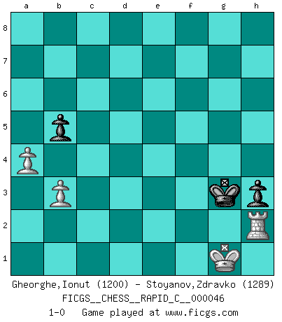 Last move : 1-0 2008 March 6 17:22:16 [Event "FICGS__CHESS__RAPID_C__000046"] [Site "FICGS"] [Date "2008.02.29"] [Round "1"] [White "Gheorghe,Ionut"] [Black "Stoyanov,Zdravko"] [Result "1-0"] [WhiteElo "1200"] [BlackElo "1289"] 1.e4 e5 2.Nf3 d6 3.d4 Be7 4.dxe5 dxe5 5.Qxd8+ Bxd8 6.Nxe5 Nf6 7.Nc3 O-O 8.Bd3 h6 9.Be3 Re8 10.Nf3 Bg4 11.Nd2 Nc6 12.O-O Ne5 13.f4 Nxd3 14.cxd3 Be7 15.f5 Bb4 16.Ndb1 Rad8 17.h3 Bxc3 18.Nxc3 Rxd3 19.Bf2 Bxh3 20.gxh3 Rxh3 21.Rae1 a5 22.e5 Ng4 23.e6 f6 24.Nd5 c6 25.Nc7 Re7 26.Bc5 Rxc7 27.e7 Rxe7 28.Rxe7 b5 29.Rd1 Ne5 30.Rd8+ Kh7 31.Rd1 Rh5 32.Rf1 Rg5+ 33.Kh2 Rh5+ 34.Kg3 Rg5+ 35.Kh4 Rg4+ 36.Kh3 Rg5 37.Rg1 Rh5+ 38.Kg2 Rxf5 39.Bf2 Nd3 40.Bb6 Nf4+ 41.Kg3 Ng6 42.Rc7 Ne5 43.Bxa5 Rg5+ 44.Kf2 Rf5+ 45.Ke2 Ng6 46.Rxc6 Re5+ 47.Kd3 Nf4+ 48.Kc2 Ne6 49.Bc3 Re4 50.Rb6 Re2+ 51.Kd1 Nf4 52.Rb7 Rg2 53.Rxg2 Nxg2 54.Bxf6 Kg6 55.Rxg7+ Kxf6 56.Rxg2 Kf5 57.Ke1 h5 58.Kf1 h4 59.Rh2 Kg4 60.Kg1 Kg3 61.b3 h3 62.a4 1-0 Philidor's defense Kingside Castling by player Black (move 7) Kingside Castling by player White (move 12) 10 pieces endgame at move 54 : White KRBPP , Black KNPPP WHITE : King + 1 Rook 1 Bishop 2 Pawns BLACK : King + 1 Knight 3 Pawns 9 pieces endgame at move 55 : White KRBPP , Black KNPP WHITE : King + 1 Rook 1 Bishop 2 Pawns BLACK : King + 1 Knight 2 Pawns 8 pieces endgame at move 55 : White KRPP , Black KNPP WHITE : King + 1 Rook 2 Pawns BLACK : King + 1 Knight 2 Pawns 7 pieces endgame at move 56 : White KRPP , Black KPP WHITE : King + 1 Rook 2 Pawns BLACK : King + 2 Pawns Player White won this chess game. Follow this game move after move (download)The only thing Chess players have in common is Chess. (Lodewijk Prins) Früher wurde jeder komplizierte Zug, jedes interessante Opfer mit großem Beifall und Enthusiasmus aufgenommen. Heute schaltet man einfach seinen Fritz an, und man kann sehen, was los ist, ob der Zug geht oder nicht. (Vladimir Kramnik) Jugadores de primera clase pierden en contra de jugadores de segunda clase porque los jugadores de segunda clase a veces juegan una partida de primer clase. (Siegbert Tarrasch) Les Echecs mettent en conflit, non pas deux intelligences, mais deux volontés. (Lasker) If computers get too powerful, we can organize them into committees. That'll do them in. (Anonymous)
