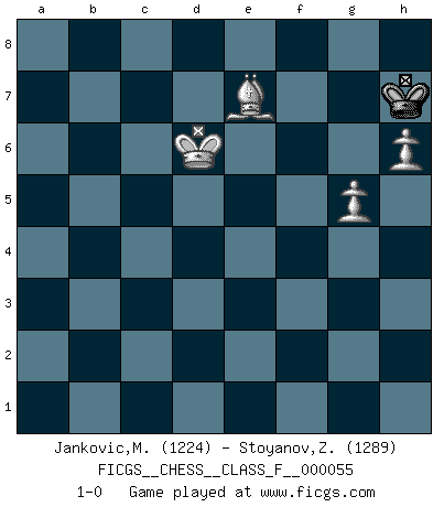 Last move : 1-0 2008 July 20 21:57:31 [Event "FICGS__CHESS__CLASS_F__000055"] [Site "FICGS"] [Date "2008.02.29"] [Round "1"] [White "Jankovic,Mladen"] [Black "Stoyanov,Zdravko"] [Result "1-0"] [WhiteElo "1224"] [BlackElo "1289"] 1.e4 e5 2.Nf3 d6 3.d4 Be7 4.Bc4 Bg4 5.h3 Bh5 6.g4 Bg6 7.Nc3 Nf6 8.dxe5 Nxe4 9.Nxe4 Bxe4 10.Qe2 d5 11.Bd3 Bxf3 12.Qxf3 O-O 13.Bf4 c6 14.O-O-O Qa5 15.Kb1 b5 16.e6 Na6 17.Bd2 Qb6 18.exf7+ Rxf7 19.Bxh7+ Kf8 20.Bf5 g6 21.Bh6+ Ke8 22.Bd7+ Kxd7 23.Qxf7 Nc7 24.Qxg6 Qxf2 25.Rhf1 Qc5 26.Rf7 Ne6 27.Qh7 Re8 28.Re1 Qd6 29.Rf6 Kd8 30.Rfxe6 Qb4 31.c3 Qc5 32.Rxe7 Rxe7 33.Rxe7 Qxe7 34.Qxe7+ Kxe7 35.Be3 a5 36.h4 Kf6 37.h5 Kg7 38.h6+ Kh7 39.g5 Kg6 40.Kc2 a4 41.Bc5 Kh7 42.b3 axb3+ 43.axb3 Kg6 44.Kd3 Kh7 45.c4 bxc4+ 46.bxc4 dxc4+ 47.Kxc4 Kg6 48.Be7 Kh7 49.Kc5 Kg6 50.Kxc6 Kh7 51.Kd6 1-0 Philidor's defense Kingside Castling by player Black (move 12) Queenside Castling by player White (move 14) 10 pieces endgame at move 43 : White KBPPPP , Black KPPP WHITE : King + 1 Bishop 4 Pawns BLACK : King + 3 Pawns 9 pieces endgame at move 45 : White KBPPP , Black KPPP WHITE : King + 1 Bishop 3 Pawns BLACK : King + 3 Pawns 8 pieces endgame at move 46 : White KBPPP , Black KPP WHITE : King + 1 Bishop 3 Pawns BLACK : King + 2 Pawns 7 pieces endgame at move 46 : White KBPP , Black KPP WHITE : King + 1 Bishop 2 Pawns BLACK : King + 2 Pawns 6 pieces endgame at move 47 : White KBPP , Black KP WHITE : King + 1 Bishop 2 Pawns BLACK : King + 1 Pawn 5 pieces endgame at move 50 : White KBPP , Black K WHITE : King + 1 Bishop 2 Pawns BLACK : King + Player White won this chess game. Follow this game move after move (download)Kasparov : J'adoube , Ivanchuk : S'il vous plaît ! (Garry Kasparov & Vassily Ivanchuk, Linares 1997) Modernes Schach erfordert enorme Anspannung. Es ist für einen normalen Menschen unmöglich das auszuhalten. (Viktor Kortschnoi) No volvere nunca a jugar contigo. Has insultado a mi amigo. - cuando un oponente se maldijo por una mala jugada (Miguel Najdorf) Demandez au pauvre Cg1 ce qu'il en pense. Eduard Gufeld à propos de la variante Saemisch de l'Est-Indienne. Shallow men believe in luck. Strong men belive in cause and effect. (Ralph Waldo Emerson)