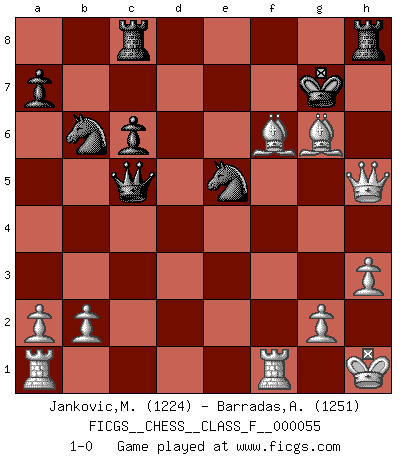 Last move : 1-0 2008 July 9 14:16:35 [Event "FICGS__CHESS__CLASS_F__000055"] [Site "FICGS"] [Date "2008.02.29"] [Round "1"] [White "Jankovic,Mladen"] [Black "Barradas,Anderson"] [Result "1-0"] [WhiteElo "1224"] [BlackElo "1251"] 1.e4 c6 2.d4 d5 3.Nc3 dxe4 4.Nxe4 Bf5 5.Ng3 e6 6.Nf3 Nf6 7.Bd3 Bg4 8.c3 h6 9.O-O Bd6 10.Qb3 b5 11.Ne5 Bxe5 12.dxe5 Nd5 13.c4 bxc4 14.Qxc4 h5 15.h3 Nb6 16.Qe4 Bf5 17.Nxf5 exf5 18.Qxf5 g6 19.Qe4 O-O 20.Bh6 Re8 21.f4 Kh7 22.Bg5 Qd5 23.Qe2 N8d7 24.Be4 Qc5+ 25.Kh1 Rac8 26.f5 Nxe5 27.fxg6+ fxg6 28.Qxh5+ Kg7 29.Bxg6 Rh8 30.Bf6+ 1-0 Caro-Kann : Classical variation Kingside Castling by player White (move 9) Kingside Castling by player Black (move 19) Player White won this chess game. Follow this game move after move (download)Chess is the art of analysis. (Mikhail Botvinnik) Jeder Fehler erscheint unglaublich dumm, wenn andre ihn begehen. (Georg Christoph Lichtenberg) Tu eres para mi la Reina en d8 y yo soy el Peón en d7!!. (GM Eduard Gufeld) Pour se monter efficace, un Cavalier a besoin d'avant-postes ! Les Cavaliers font les meilleurs bloqueurs de pions passés. The project of the man are lower than those of the sky. (Chinese proverb)