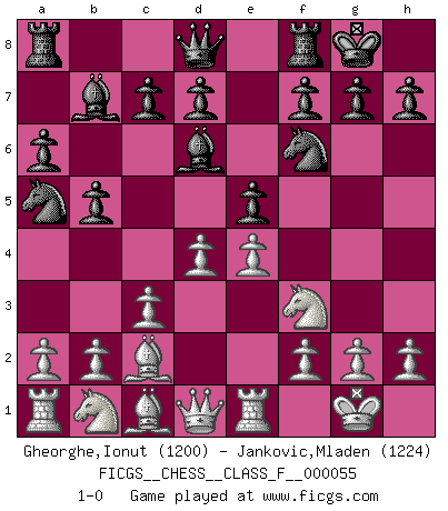 Last move : 1-0 2008 April 17 7:52:17 [Event "FICGS__CHESS__CLASS_F__000055"] [Site "FICGS"] [Date "2008.02.29"] [Round "1"] [White "Gheorghe,Ionut"] [Black "Jankovic,Mladen"] [Result "1-0"] [WhiteElo "1200"] [BlackElo "1224"] 1.e4 e5 2.Nf3 Nc6 3.Bb5 a6 4.Ba4 b5 5.Bb3 Nf6 6.O-O Bd6 7.Re1 O-O 8.c3 Bb7 9.d4 Na5 10.Bc2 1-0 This chess game has been lost on time (started : 2008.02.29 15:43:29) Ruy Lopez : Caro variation Kingside Castling by player White (move 6) Kingside Castling by player Black (move 7) Player White won this chess game. Follow this game move after move (download)Nowadays, when you're not a grandmaster at 14, you can forget about it. (Anand Viswanathan) Nie in meinem Leben habe ich die französische Verteidigung gespielt, welche die Stumpfsinnigste von allen ist. (Wilhelm Steinitz) Evita las multitudes. Haz independientemente tu propio razonamiento. Trata de ser el jugador de Ajedrez, no la pieza de Ajedrez. (Ralph Charell) Celui qui prend des risques peut perdre, celui qui n'en prend pas perd toujours. (Xavier Tartacover) Whenever people agree with me, I always feel I must be wrong. (Oscar Wilde)