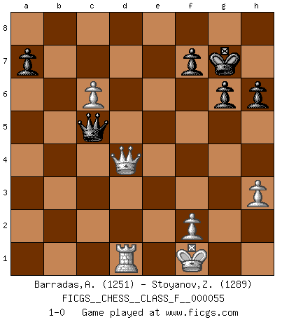 Last move : 1-0 2008 March 14 18:54:8 [Event "FICGS__CHESS__CLASS_F__000055"] [Site "FICGS"] [Date "2008.02.29"] [Round "1"] [White "Barradas,Anderson"] [Black "Stoyanov,Zdravko"] [Result "1-0"] [WhiteElo "1251"] [BlackElo "1289"] 1.e4 e5 2.Nf3 d6 3.d4 Be7 4.Nc3 Bg4 5.Be2 h6 6.h3 Bh5 7.O-O Bg6 8.Bd3 Nf6 9.Re1 O-O 10.dxe5 dxe5 11.Nxe5 Bh7 12.Bf4 Bd6 13.Nd5 Nxd5 14.exd5 Bxd3 15.Qxd3 Qf6 16.g3 Re8 17.Qb5 c6 18.Qxb7 cxd5 19.Qxa8 Bxe5 20.Qxd5 Nc6 21.a3 Re7 22.Rad1 Kh7 23.Re4 Bxb2 24.Rxe7 Nxe7 25.Qd3+ Ng6 26.c4 Bxa3 27.Qxa3 Nxf4 28.gxf4 Qxf4 29.c5 Qg5+ 30.Kf1 Qe7 31.Qd3+ g6 32.c6 Kg7 33.Qd7 Qc5 34.Qd4+ 1-0 Philidor's defense Kingside Castling by player White (move 7) Kingside Castling by player Black (move 9) Player White won this chess game. Follow this game move after move (download)Any material change in a position must come about by mate, a capture, or a Pawn promotion. (Purdy) Die Jungen erwarten, dass Opa einfach umfällt. Dann aber kann Opa fünf Stunden lang Schach spielen und die jungen Gegner an die Wand drücken. (Viktor Kortschnoi) Estaba muy claro de que el punto vulnerable del Gran Maestro Americano (Bobby Fischer) radicaba en las posiciones de doble filo, colgantes, irracionales, donde el siempre falló en encontrar un triunfo aún en una posición de clara victoria. (Efim Geller) Le temps de noter son nom sur la feuille de partie, j'étais déjà en zeitnot ! D'un modeste amateur apparié lors de la première ronde d'un open contre le grand-maître Azmaïparashvili. Don't anthropomorphize computers - they hate it. (Anonymous)