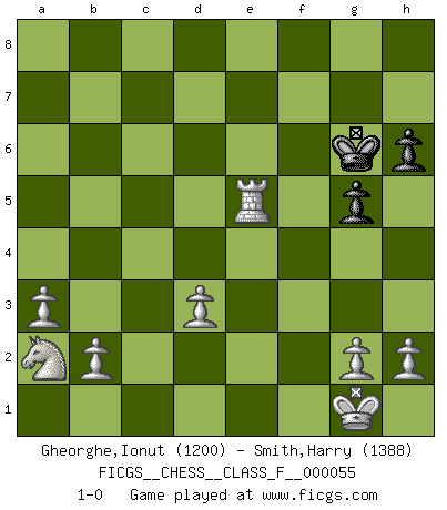 Last move : 1-0 2008 June 12 5:0:45 [Event "FICGS__CHESS__CLASS_F__000055"] [Site "FICGS"] [Date "2008.02.29"] [Round "1"] [White "Gheorghe,Ionut"] [Black "Smith,Harry"] [Result "1-0"] [WhiteElo "1200"] [BlackElo "1388"] 1.e4 e6 2.d4 d5 3.e5 Ne7 4.Nf3 Ng6 5.Be2 Be7 6.O-O O-O 7.Nc3 Nc6 8.a3 b6 9.Bd3 Nh4 10.Be3 Na5 11.Na2 c5 12.Nxh4 Bxh4 13.dxc5 d4 14.Bd2 Bb7 15.cxb6 axb6 16.Qg4 g6 17.Bh6 Qd5 18.f3 Rfe8 19.Qxh4 Qxe5 20.Rae1 Qh8 21.Bg5 Qg7 22.Bf6 Qf8 23.Bxd4 Nc6 24.Bxb6 Nb8 25.Bd4 Nc6 26.Bc3 e5 27.f4 Qg7 28.fxe5 Nxe5 29.Qf4 Ra5 30.Bxa5 g5 31.Qf6 Re6 32.Qxg7+ Kxg7 33.Bc3 f6 34.Bxe5 fxe5 35.Be4 Ba6 36.Rf5 h6 37.Bd3 Bxd3 38.cxd3 Kg6 39.Rfxe5 Rxe5 40.Rxe5 1-0 French : Advance variation Kingside Castling by player White (move 6) Kingside Castling by player Black (move 6) Player White won this chess game. Follow this game move after move (download)You know, comrade Pachman, I don't enjoy being a Minister, I would rather play Chess like you. (Che Guevara) Ja, ich habe einmal eine Blitzpartie gespielt, es war in einem Zug, 1929. --im Interview 1989 (Mikhail Moiseyevich Botvinik) Si tu oponente te ofrece un empate, trata de averiguar porque piensa él que esta en una posición peor. (Nigel Short) Même si vous avez un bon coup à faire, regardez toujours s'il n'y en a pas un qui lui soit préférable. (Pedro Damiano) 'preceded by its own quotation yields a falsehood' preceded by its own quotation yields a falsehood. (W. V. O. Quine - Set Theory And Its Logic, 1953)