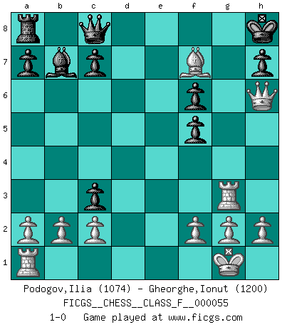 Last move : 1-0 2008 March 18 21:11:47 [Event "FICGS__CHESS__CLASS_F__000055"] [Site "FICGS"] [Date "2008.02.29"] [Round "1"] [White "Podogov,Ilia"] [Black "Gheorghe,Ionut"] [Result "1-0"] [WhiteElo "1074"] [BlackElo "1200"] 1.e4 e5 2.Nf3 Nc6 3.Nc3 Nf6 4.d4 exd4 5.Nxd4 Bb4 6.Nxc6 bxc6 7.Bd3 d5 8.exd5 cxd5 9.O-O O-O 10.Bg5 Bb7 11.Qf3 Be7 12.Rfe1 Qc8 13.Rxe7 d4 14.Qf4 dxc3 15.Bxf6 gxf6 16.Qh6 f5 17.Re3 f6 18.Bc4+ Rf7 19.Rg3+ Kh8 20.Bxf7 1-0 Four knights : Scotch, 4...exd4 Kingside Castling by player White (move 9) Kingside Castling by player Black (move 9) Player White won this chess game. Follow this game move after move (download)Chess is played with the mind and not with the hands ! (Renaud and Kahn) Das Schachspiel ist ein See, in welchem eine Mücke baden und ein Elefant ertrinken kann. (Emanuel Lasker) Observen a Garry Kasparov. Después de una derrota, invariablemente el gana la próxima partida. Prácticamente hace pedazos a su siguiente oponente. Eso es algo que tenemos que aprender a lograr. (Maurice Ashley) Demandez au pauvre Cg1 ce qu'il en pense. Eduard Gufeld à propos de la variante Saemisch de l'Est-Indienne. Every now and then a man's mind is stretched by a new idea and never shrinks back to its former dimensions. (Oliver Wendell Holmes, Sr.)