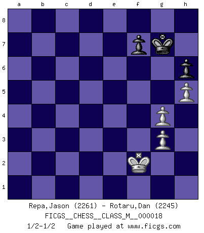 Last move : 1/2-1/2 2009 September 26 20:18:48 [Event "FICGS__CHESS__CLASS_M__000018"] [Site "FICGS"] [Date "2008.03.01"] [Round "1"] [White "Repa,Jason"] [Black "Rotaru,Dan"] [Result "1/2-1/2"] [WhiteElo "2261"] [BlackElo "2245"] 1.e4 e5 2.Nf3 Nc6 3.Bb5 a6 4.Ba4 Nf6 5.O-O Be7 6.Re1 b5 7.Bb3 d6 8.c3 O-O 9.h3 Bb7 10.Bc2 d5 11.exd5 Qxd5 12.d4 exd4 13.cxd4 Qh5 14.Nc3 Rad8 15.a4 b4 16.Ne2 Bd6 17.Ng3 Bxg3 18.fxg3 Qd5 19.Be3 Qd6 20.Kh2 Nh5 21.Bf2 Nf6 22.Rc1 Rde8 23.Qd2 Na5 24.Be3 Nh5 25.Qf2 Bd5 26.Nh4 Nc4 27.Nf5 Qd8 28.Bh6 Rxe1 29.Rxe1 gxh6 30.b3 Na3 31.Ne7+ Kg7 32.Nxd5 Qxd5 33.Re5 Qd6 34.Rxh5 Nxc2 35.Qxc2 Re8 36.Rf5 Re6 37.Qc4 Rf6 38.Rd5 Qe7 39.Rc5 Rf2 40.d5 Qe2 41.Qxe2 Rxe2 42.Rxc7 Rb2 43.Ra7 Rxb3 44.Rxa6 Ra3 45.g4 b3 46.Rb6 Rxa4 47.Rxb3 Rd4 48.Rb5 Rd3 49.h4 Kg8 50.g3 Rd2+ 51.Kh3 Kg7 52.Ra5 Rd4 53.h5 Rd2 54.Rb5 Kf8 55.Ra5 Kg7 56.Rb5 Kf8 57.Rb6 Rxd5 58.Rxh6 Kg7 59.Ra6 h6 60.Kh4 Rb5 61.Rc6 Re5 62.Rc7 Rb5 63.Rc1 Re5 64.Rc4 Kf6 65.Rc7 Kg7 66.Kh3 Kf6 67.Rc6+ Re6 68.Rc4 Re5 69.Ra4 Rd5 70.Ra8 Kg7 71.Ra2 Kf6 72.Rf2+ Ke6 73.Re2+ Kf6 74.Rf2+ Ke6 75.Re2+ Kf6 76.Rb2 Kg7 77.Rf2 Re5 78.Kg2 Rb5 79.Rf1 Rb2+ 80.Rf2 Rxf2+ 81.Kxf2 1/2-1/2 Ruy Lopez : Closed Kingside Castling by player White (move 5) Kingside Castling by player Black (move 8) 10 pieces endgame at move 57 : White KRPPP , Black KRPPP WHITE : King + 1 Rook 3 Pawns BLACK : King + 1 Rook 3 Pawns 9 pieces endgame at move 58 : White KRPPP , Black KRPP WHITE : King + 1 Rook 3 Pawns BLACK : King + 1 Rook 2 Pawns 8 pieces endgame at move 80 : White KPPP , Black KRPP WHITE : King + 3 Pawns BLACK : King + 1 Rook 2 Pawns 7 pieces endgame at move 81 : White KPPP , Black KPP WHITE : King + 3 Pawns BLACK : King + 2 Pawns This chess game ended in a draw. Follow this game move after move (download)The beauty of a move lies not in its' appearance but in the thought behind it. (Siegbert Tarrasch) Es ist peinlich, dass ich nie Weltmeister wurde. Es wäre leicht, Leonid Breschnjew als Ursache vorzuschieben, dessen Apparat den Vorzeigekommunisten Anatoli Karpow in allem unterstützte. Aber Garri Kasparow zum Beispiel, der ebenfalls von den Sowjets unerwünscht war, hat trotz der Widerstände den WM-Titel erobert. (Viktor Kortschnoi) Si no le temes a Spassky, entonces elimino el elemento del dinero. (Jim Slater) Le profane ne songe pas à la somme de jouissance dont il se prive, qui méconnaît ce jeu aux ressources aussi variées que passionnantes. (Jean-Marie Jeanton-Lamarche) Before all elsed, be armed. (Niccolo Machiavelli)