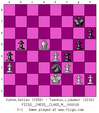 Last move : 0-1 2008 May 7 7:56:19 [Event "FICGS__CHESS__CLASS_M__000018"] [Site "FICGS"] [Date "2008.03.01"] [Round "1"] [White "Kuhne,Detlev"] [Black "Tsenkov,Ljubomir"] [Result "0-1"] [WhiteElo "2358"] [BlackElo "2216"] 1.d4 d5 2.c4 e6 3.Nc3 Nf6 4.Nf3 dxc4 5.e4 Bb4 6.Bg5 c5 7.Bxc4 cxd4 8.Nxd4 Qa5 9.Bd2 Qc5 10.Bb5+ Bd7 11.Nb3 Qe7 12.Bd3 Nc6 13.O-O O-O 14.a3 Bd6 15.Bg5 h6 16.Bh4 Bf4 17.Ne2 e5 18.Nxf4 exf4 19.f3 Be6 20.Bf2 Rfd8 21.Rc1 Nd7 22.Nc5 Nde5 23.Rc3 Nd4 24.Bxd4 Rxd4 25.Qc1 Rad8 26.Be2 Rd2 27.Nxe6 Qxe6 28.Rc2 Rxc2 29.Qxc2 Qb6+ 30.Kh1 Kh7 31.Qc3 Qd4 32.Qxd4 Rxd4 33.Rd1 Rxd1+ 34.Bxd1 Nd3 35.Bb3 Nxb2 36.Bxf7 g5 37.Kg1 Kg7 38.Be6 b5 39.Bb3 a5 40.Kf1 a4 41.Bd5 Nd1 42.Ke2 Ne3 0-1 QGD : 4.Nf3 Kingside Castling by player White (move 13) Kingside Castling by player Black (move 13) Player Black won this chess game. Follow this game move after move (download)Chess is in its essence a game, in its form an art, and in its execution a science. (Baron Tassilo) Bogoljubow: Matt in vier Zügen! Tartakower: Ich verbitte mir jede Belästigung! (Savielly Grigorievitsch Tartakower) Tu puedes aprender mucho mas de una partida que pierdas que de una partida ganada. Tendras que perder cientos de partidas antes de llegar a ser un buen jugador. (Jose Raul Capablanca) 'L'échange des dames est un coup dur pour les deux adversaires...' Un journaliste lors d'une partie du match Spassky-Fischer It's not the size of the dog in the fight, it's the size of the fight in the dog. (Mark Twain)