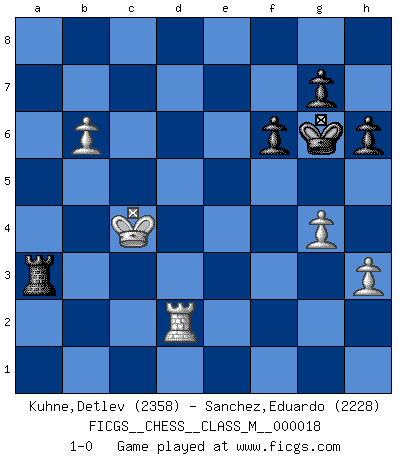 Last move : 1-0 2009 February 3 8:29:39 [Event "FICGS__CHESS__CLASS_M__000018"] [Site "FICGS"] [Date "2008.03.01"] [Round "1"] [White "Kuhne,Detlev"] [Black "Sanchez,Eduardo"] [Result "1-0"] [WhiteElo "2358"] [BlackElo "2228"] 1.d4 d5 2.c4 c6 3.Nf3 Nf6 4.Nc3 a6 5.e3 b5 6.b3 Bg4 7.Be2 e6 8.O-O Bd6 9.h3 Bh5 10.Bb2 O-O 11.Ne5 Bxe2 12.Nxe2 Nfd7 13.cxd5 cxd5 14.Rc1 Ra7 15.Nf4 Rc7 16.Qd2 Qc8 17.Nfd3 Nxe5 18.dxe5 Be7 19.Qa5 Rc6 20.Ba3 Bxa3 21.Qxa3 Rd8 22.Rxc6 Nxc6 23.Rc1 Qb7 24.Rc2 a5 25.Qc5 Rc8 26.Qd6 h6 27.Nc5 Qe7 28.Nd7 Qxd6 29.exd6 Rd8 30.Rxc6 Rxd7 31.Kf1 a4 32.b4 e5 33.a3 f6 34.Rb6 Kf7 35.Rxb5 Rxd6 36.Ra5 Rc6 37.Rxa4 Rc1+ 38.Ke2 Rc2+ 39.Ke1 Rb2 40.Ra7+ Kg6 41.g4 Rb3 42.Kd1 d4 43.exd4 exd4 44.Kc2 Rc3+ 45.Kb2 Rf3 46.b5 Rxf2+ 47.Kb3 Rf3+ 48.Kc4 d3 49.b6 d2 50.Rd7 Rxa3 51.Rxd2 1-0 This chess game has been lost on time (started : 2008.03.01 14:27:3) QGD Slav : 4.Nc3 Kingside Castling by player White (move 8) Kingside Castling by player Black (move 10) 10 pieces endgame at move 51 : White KRPPP , Black KRPPP WHITE : King + 1 Rook 3 Pawns BLACK : King + 1 Rook 3 Pawns Player White won this chess game. Follow this game move after move (download)By this measure (on the gap between Fischer & his contemporaries), I consider him the greatest world champion. (Garry Kasparov) Wer mein Gambit spielt, muß bereit sein, alle Brücken hinter sich abzubrechen. Es verändert den ganzen Menschen. Es wirkt wie ein Zauberstab und fördert verkümmerte, gute Charakter- eigenschaften wieder zu Tage. (Emil Joseph Diemer) Me gusta decir que Bobby Fischer fue el mejor jugador que jamás haya existido. Pero lo que hizo de Fischer un genio, fue su habilidad de mezclar una frescura y pragmatismo Americano con ideas Rusas acerca de la estrategia. (Bruce Pandolfini) En blitz, le Cavalier l'emporte sur le Fou. (Vlastimil Hort) Panic is a sudden desertion of us, an a going over to the enemy of our imagination. (Christian Nevell Bovee)