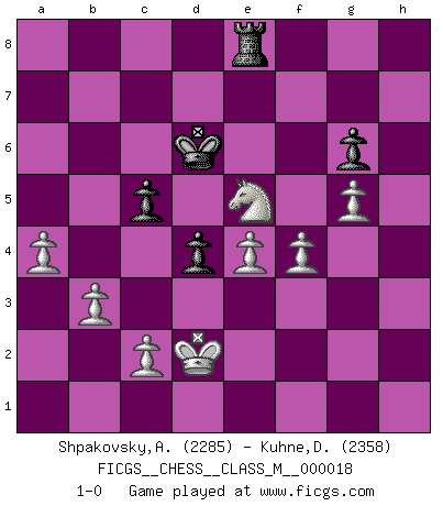 Last move : 1-0 2008 June 18 11:22:59 [Event "FICGS__CHESS__CLASS_M__000018"] [Site "FICGS"] [Date "2008.03.01"] [Round "1"] [White "Shpakovsky,Alexander"] [Black "Kuhne,Detlev"] [Result "1-0"] [WhiteElo "2285"] [BlackElo "2358"] 1.e4 c5 2.Nf3 Nc6 3.d4 cxd4 4.Nxd4 Nf6 5.Nc3 d6 6.Bg5 e6 7.Qd2 a6 8.O-O-O h6 9.Nxc6 bxc6 10.Bf4 d5 11.Qe3 Be7 12.Be2 O-O 13.h4 Re8 14.g4 Nd7 15.Qg3 e5 16.Bd2 d4 17.Na4 Nf8 18.g5 hxg5 19.hxg5 Ng6 20.Bc4 Bd6 21.Rh7 Be6 22.Bxe6 Rxe6 23.Rdh1 a5 24.Qh3 Kf8 25.Qf5 Kg8 26.b3 Rb8 27.Nb2 Qc7 28.Nd3 Rbe8 29.a4 Kf8 30.Kb1 c5 31.Nb2 Qd8 32.Nc4 Bc7 33.R1h3 Qd7 34.Bxa5 Bxa5 35.Nxa5 Qc7 36.Nc4 Rb8 37.R3h6 Rbe8 38.Rxg6 Rxg6 39.Rh8+ Ke7 40.Rxe8+ Kxe8 41.Nxe5 Re6 42.f4 g6 43.Qh3 Ke7 44.Qh8 Qd8 45.Qxd8+ Kxd8 46.Nxf7+ Kc7 47.Ne5 Kd6 48.Kc1 Re8 49.Kd2 1-0 Sicilian defense Queenside Castling by player White (move 8) Kingside Castling by player Black (move 12) Player White won this chess game. Follow this game move after move (download)The defensive power of a pinned piece is only imaginary. (Aaron Nimzovich) Garry Kasparov war erst in der Großmeister-Organisation GMA, dann in der Profischach-Vereinigung PCA, zum Schluss kehrte er wieder in den Schoß der FIDE zurück. Aber gut, manche Leute sind flexibel (Viswanathan Anand) Las ideas audaces son como las piezas del Ajedrez que avanzan hacia adelante. Ellas pueden ser vencidas, pero también pueden iniciar una partida victoriosa. (Goethe) Les Echecs ne sont pas pour les âmes timides. Ils requièrent un homme entier, qui ne s'arrête pas aveuglément à ce qui a été déjà établi, mais qui tente individuellement de sonder les profondeurs du jeu. (W. Steinitz) If you are good, you will be assigned all the work. If you are really good, you will get out of it. (Dan Rotaru)