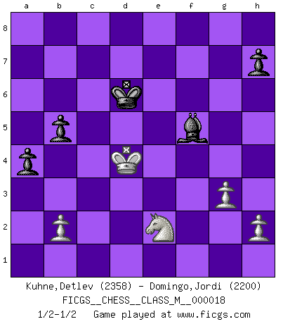 Last move : 1/2-1/2 2008 December 30 14:15:38 [Event "FICGS__CHESS__CLASS_M__000018"] [Site "FICGS"] [Date "2008.03.01"] [Round "1"] [White "Kuhne,Detlev"] [Black "Domingo,Jordi"] [Result "1/2-1/2"] [WhiteElo "2358"] [BlackElo "2200"] 1.d4 d5 2.c4 dxc4 3.e4 Nf6 4.e5 Nd5 5.Bxc4 Nb6 6.Bb3 Nc6 7.Ne2 Bf5 8.Nbc3 e6 9.O-O Qd7 10.Be3 O-O-O 11.a3 Kb8 12.Qc1 Ne7 13.Rd1 Ned5 14.a4 a5 15.Bg5 Be7 16.Bxd5 Nxd5 17.Nxd5 Bxg5 18.Qxg5 Qxd5 19.Nc3 Qb3 20.Rd2 Bg6 21.Nb5 Rd7 22.Qe3 Qxe3 23.fxe3 f6 24.exf6 gxf6 25.Rf1 f5 26.Rc1 Rhd8 27.Rf2 e5 28.dxe5 Re8 29.Rfc2 Rxe5 30.Rxc7 Rxc7 31.Nxc7 Rxe3 32.Nb5 Be8 33.Nc3 Rd3 34.Rf1 Bd7 35.Rf4 Rd2 36.Rf2 Rd4 37.g3 Kc7 38.Rxf5 Bxf5 39.Nb5+ Kb6 40.Nxd4 Bd7 41.Kf2 Bxa4 42.Ke3 Bd7 43.Kd3 Kc5 44.Kc3 b5 45.Nb3+ Kb6 46.Nd2 Bf5 47.Kd4 Kc6 48.Nb3 a4 49.Nc1 Kd6 50.Ne2 1/2-1/2 QGA : 3.e4 Kingside Castling by player White (move 9) Queenside Castling by player Black (move 10) 10 pieces endgame at move 41 : White KNPPP , Black KBPPP WHITE : King + 1 Knight 3 Pawns BLACK : King + 1 Bishop 3 Pawns This chess game ended in a draw. Follow this game move after move (download)Your body has to be in top condition. Your Chess deteriorates as your body does. You can't separate body from mind. (Bobby Fischer) Ich kenne Menschen, die allen Willen der Welt besitzen und doch nicht Schach spielen können. (Robert James Fischer) En manos de Fischer's, una diminuta ventaja teórica es tan buena como tener una Reina de ventaja. (Isaac Kashdan) Le succès, c'est être capable d'aller d'échec en échec sans perdre son enthousiasme. (Winston Churchill) We're missing something. (Gregory House, House M.D.)