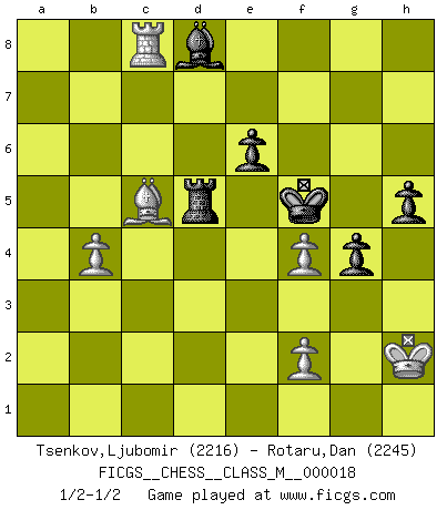 Last move : 1/2-1/2 2008 May 21 13:37:28 [Event "FICGS__CHESS__CLASS_M__000018"] [Site "FICGS"] [Date "2008.03.01"] [Round "1"] [White "Tsenkov,Ljubomir"] [Black "Rotaru,Dan"] [Result "1/2-1/2"] [WhiteElo "2216"] [BlackElo "2245"] 1.c4 Nf6 2.Nc3 c6 3.Nf3 d5 4.d4 e6 5.Bg5 h6 6.Bh4 dxc4 7.e4 g5 8.Bg3 b5 9.Be2 Bb7 10.Ne5 Nbd7 11.Qc2 Bg7 12.Rd1 Qe7 13.O-O O-O 14.b3 cxb3 15.axb3 Rac8 16.Rfe1 Nxe5 17.Bxe5 Rfd8 18.Bf3 g4 19.Be2 h5 20.Qb2 c5 21.d5 b4 22.d6 Qf8 23.Nb5 Nxe4 24.d7 Rc6 25.Nxa7 Rc7 26.Bb5 Bd5 27.Nc8 R7xc8 28.dxc8Q Rxc8 29.Rd3 Nc3 30.Rxc3 bxc3 31.Qxc3 f6 32.Bf4 Kf7 33.Bc4 Rd8 34.h4 Qe7 35.g3 Qa7 36.Ra1 Qb6 37.Ra6 Qb7 38.Kh2 Bxc4 39.Qxc4 Qd5 40.Qc2 f5 41.Ra7+ Kg6 42.Be3 Bf6 43.Qxc5 Qxc5 44.Bxc5 f4 45.gxf4 Bxh4 46.b4 Rd5 47.Rc7 Bd8 48.Rc8 Kf5 1/2-1/2 English Opening Kingside Castling by player White (move 13) Kingside Castling by player Black (move 13) Promotion Queen by player White (move 28) This chess game ended in a draw. Follow this game move after move (download)There just isn't enough televised Chess. (David Letterman) Wenn Du absolut nicht mehr weißt, was Du tun sollst, dann ist es Zeit für Panik. (John van der Wiel) La pasion por jugar al Ajedrez es una de las mas inexplicables en el mundo. (H.G. Wells) C'est une question de caractère, Beaucoup de gens perdent leur motivation très vite. D'autres, ils sont rares, peuvent la conserver très longtemps. J'aime les échecs, encore aujourd'hui je suis heureux d'analyser des parties. J'aime toujours gagner, je déteste encore perdre. Bien jouer est important pour mon intégrité intellectuelle et morale. Et puis les échecs vivent en ce moment une période historique grâce à Internet. Ils se développent dans les systèmes éducatifs à travers le monde. Ils sortent de leur ghetto, et c'est mon rôle de mener à bien cette révolution. (Gary Kasparov) Waiting for chance ? Play in casinos. (FICGS proverb)