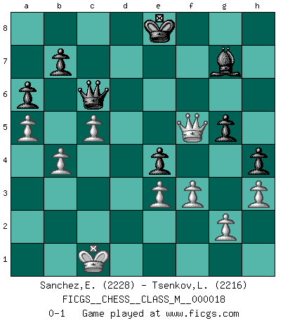 Last move : 0-1 2008 October 11 2:12:42 [Event "FICGS__CHESS__CLASS_M__000018"] [Site "FICGS"] [Date "2008.03.01"] [Round "1"] [White "Sanchez,Eduardo"] [Black "Tsenkov,Ljubomir"] [Result "0-1"] [WhiteElo "2228"] [BlackElo "2216"] 1.d4 Nf6 2.Nf3 d5 3.Bg5 Ne4 4.Bf4 c5 5.e3 Nc6 6.c3 Qb6 7.Qc1 f6 8.Nbd2 g5 9.Bg3 h5 10.dxc5 Qxc5 11.Bd3 Bf5 12.Qb1 h4 13.Bc7 e5 14.Nxe4 dxe4 15.Bxe4 Bxe4 16.Qxe4 Qe7 17.Bxe5 Nxe5 18.O-O-O Nc6 19.Qf5 Rd8 20.h3 a6 21.Rhe1 Bg7 22.Qg6+ Qf7 23.Qe4+ Ne5 24.Qa4+ Rd7 25.Nxe5 fxe5 26.Re2 Qe6 27.Rxd7 Qxd7 28.Qe4 O-O 29.Rd2 Qe7 30.f3 Re8 31.Rd5 Qe6 32.a4 Kf7 33.c4 Re7 34.a5 Rd7 35.Rxd7+ Qxd7 36.b4 Ke8 37.Qg6+ Qf7 38.Qe4 Qe6 39.c5 Qc6 40.Qf5 e4 0-1 Queen's pawn game Queenside Castling by player White (move 18) Kingside Castling by player Black (move 28) Player Black won this chess game. Follow this game move after move (download)Later, I began to succeed in decisive games. Perhaps because I realized a very simple truth: not only was I worried, but also my opponent. (Mikhail Tal) Glücklicherweise sind Großmeister Ruben Fines reine Schachbücher weniger phallozentrisch [als seine Schachpsychologie] und deswegen auch weniger lächerlich. (Nigel Short) Una mala movida nulifica cuarenta buenas. (Horowitz) Shah mat. Le roi est mort. Cri de fierté d'un joueur venant de terrasser son adversaire, courtoisement, sans effusion de sang. Heh, heh, heh. Time to abandon ship. (General Grievous in Star Wars ep.3)