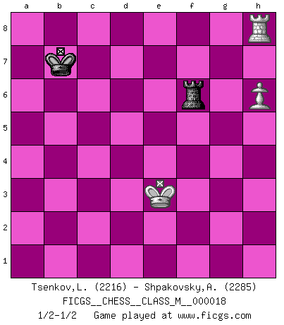 Last move : 1/2-1/2 2008 June 2 12:32:4 [Event "FICGS__CHESS__CLASS_M__000018"] [Site "FICGS"] [Date "2008.03.01"] [Round "1"] [White "Tsenkov,Ljubomir"] [Black "Shpakovsky,Alexander"] [Result "1/2-1/2"] [WhiteElo "2216"] [BlackElo "2285"] 1.e4 c5 2.Nf3 d6 3.d4 cxd4 4.Nxd4 Nf6 5.Nc3 Bd7 6.Be2 g6 7.g4 Bg7 8.g5 Nh5 9.Be3 Nc6 10.Bxh5 gxh5 11.Nd5 Rg8 12.h4 Nxd4 13.Bxd4 Bg4 14.Qd3 Bxd4 15.Qxd4 Rc8 16.Qxa7 Qd7 17.Kd2 Qb5 18.Nc3 Qxb2 19.Qa4+ Bd7 20.Qb3 Qxb3 21.axb3 f5 22.gxf6 exf6 23.Ra7 Rg2 24.Rf1 Rb8 25.Ra5 f5 26.Nb5 Ke7 27.Nd4 fxe4 28.Rxh5 Rh8 29.Ke3 Be8 30.Ra5 Bc6 31.c4 Rg4 32.Rd1 Bd7 33.Rh5 Kd8 34.Nb5 Bxb5 35.cxb5 Kd7 36.Rd4 h6 37.Rxe4 Rg6 38.Rf4 Rh7 39.Rhf5 Re7+ 40.Kd4 Rge6 41.Kd3 Rg6 42.Rf6 Rxf6 43.Rxf6 Re5 44.Rf7+ Kc8 45.b6 Rb5 46.Rc7+ Kb8 47.Kc4 Rxb6 48.Rh7 Kc8 49.h5 d5+ 50.Kxd5 Rxb3 51.Rxh6 Rf3 52.Kd6 b5 53.Rh8+ Kb7 54.Kc5 Rxf2 55.Kxb5 Rf5+ 56.Kc4 Kc6 57.h6 Rf4+ 58.Kd3 Kb7 59.Ke3 Rf6 1/2-1/2 Sicilian 10 pieces endgame at move 47 : White KRPPP , Black KRPPP WHITE : King + 1 Rook 3 Pawns BLACK : King + 1 Rook 3 Pawns 9 pieces endgame at move 50 : White KRPPP , Black KRPP WHITE : King + 1 Rook 3 Pawns BLACK : King + 1 Rook 2 Pawns 8 pieces endgame at move 50 : White KRPP , Black KRPP WHITE : King + 1 Rook 2 Pawns BLACK : King + 1 Rook 2 Pawns 7 pieces endgame at move 51 : White KRPP , Black KRP WHITE : King + 1 Rook 2 Pawns BLACK : King + 1 Rook 1 Pawn 6 pieces endgame at move 54 : White KRP , Black KRP WHITE : King + 1 Rook 1 Pawn BLACK : King + 1 Rook 1 Pawn 5 pieces endgame at move 55 : White KRP , Black KR WHITE : King + 1 Rook 1 Pawn BLACK : King + 1 Rook This chess game ended in a draw. Follow this game move after move (download)In life, as in Chess, one's own Pawns block one's way. A man's very wealth, ease, leisure, children, books, which should help him to win, more often checkmate him. (Charles Buxton) Unter Putin wird alles Geld aus Russland wie von einem Staubsauger nach Moskau umgeleitet, das ist wie ein schwarzes Loch. (Garry Kasparov) Alguna parte de un error es siempre correcto. (Savielly Tartakover) J'apprécie les joueurs d'est-indienne, c'est grâce à eux que je nourris ma famille depuis tant d'années. (Petrosian) Locking firmely the window serves nothing, only small thiefs pass through there, the big thiefs enter through the front door. (Luc-Olivier Leclerc)
