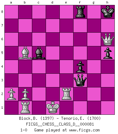 Last move : 1-0 2008 September 25 9:1:29 [Event "FICGS__CHESS__CLASS_D__000081"] [Site "FICGS"] [Date "2008.03.02"] [Round "1"] [White "Block,Benjamin"] [Black "Tenorio,Elizabeth"] [Result "1-0"] [WhiteElo "1397"] [BlackElo "1700"] 1.d4 Nf6 2.c4 d6 3.Nc3 g6 4.e4 Bg7 5.Nf3 c6 6.Be2 O-O 7.O-O Nbd7 8.Re1 e5 9.Bf1 Nh5 10.d5 c5 11.h3 f5 12.exf5 gxf5 13.Ng5 Ndf6 14.Ne6 Bxe6 15.dxe6 a6 16.g4 fxg4 17.hxg4 Nf4 18.Bxf4 exf4 19.e7 Qd7 20.exf8Q+ Rxf8 21.f3 b5 22.cxb5 axb5 23.Bxb5 Qd8 24.Rb1 d5 25.g5 d4 26.gxf6 Qxf6 27.Qb3+ Kh8 28.Ne4 Qg6+ 29.Kf2 d3 30.Qxd3 Bd4+ 31.Ke2 Qg2+ 32.Kd1 h5 33.Nxc5 Be3 34.Re2 Qxf3 35.Qd6 Bxc5 36.Qh6+ 1-0 This chess game has been lost on time (started : 2008.03.02 3:3:10) Old Indian defense Kingside Castling by player Black (move 6) Kingside Castling by player White (move 7) Promotion Queen by player White (move 20) Player White won this chess game. Follow this game move after move (download)Nowadays, when you're not a grandmaster at 14, you can forget about it. (Anand Viswanathan) Ich erzeugte keinen Neid, da mich die Schachspieler als Musiker und die Musiker als Schachspieler betrachteten. (Mark Taimanov) A la fecha, Fischer esta simplemente un nivel arriba de todos los mejores jugadores de Ajedrez del mundo. (John Jacobs) Les Echecs ont trois composantes : le temps, l'espace et le matériel en dernier. (Mikhail Tal) The only sure thing about luck is that it will change. (Wilson Mizner)