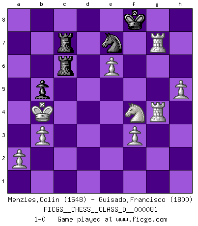Last move : 1-0 2008 May 19 22:13:43 [Event "FICGS__CHESS__CLASS_D__000081"] [Site "FICGS"] [Date "2008.03.02"] [Round "1"] [White "Menzies,Colin"] [Black "Guisado,Francisco"] [Result "1-0"] [WhiteElo "1548"] [BlackElo "1800"] 1.e4 e5 2.f4 exf4 3.Bc4 Be7 4.Nc3 Bh4+ 5.Kf1 d6 6.d4 Ne7 7.Qh5 Ng6 8.Bxf4 Qf6 9.Nf3 Qxf4 10.Nd5 Bg4 11.Qxg6 hxg6 12.Nxf4 Bxf3 13.gxf3 Nd7 14.Ke2 O-O-O 15.Bxf7 Rhf8 16.Nxg6 Rxf7 17.Nxh4 Rh8 18.Ng6 Rh6 19.Rag1 Kd8 20.h4 Ke8 21.h5 Nf6 22.Rg5 Nh7 23.Ra5 a6 24.Ke3 Nf6 25.Nf4 Nd7 26.Rg5 Rhf6 27.Rh4 c6 28.Rhg4 Kf8 29.e5 dxe5 30.dxe5 Re7 31.Kd4 c5+ 32.Kd5 Nb6+ 33.Kxc5 Rc6+ 34.Kb4 Rec7 35.b3 Nc8 36.c4 b5 37.cxb5 axb5 38.e6 Ne7 39.Rxg7 1-0 KGA : Bishop's gambit Queenside Castling by player Black (move 14) Player White won this chess game. Follow this game move after move (download)It is no time to be playing Chess when the house is on fire. (Italian Proverb) Schach ist ein schwarz-weisser Dschungel. (Garry Kasparov) El Ajedrez es sobre todo, ¡una pelea!. (Emanuel Lasker) Ce n'est pas pour s'amuser qu'il joue aux échecs : il célèbre un culte. (Vladimir Nabokov) I believe in luck. How else can you explain the success of those you dislike ? (Jean Cocteau)