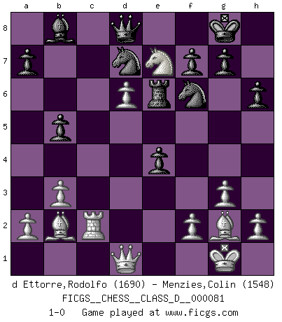 Last move : 1-0 2008 April 7 21:3:43 [Event "FICGS__CHESS__CLASS_D__000081"] [Site "FICGS"] [Date "2008.03.02"] [Round "1"] [White "d Ettorre,Rodolfo"] [Black "Menzies,Colin"] [Result "1-0"] [WhiteElo "1690"] [BlackElo "1548"] 1.Nf3 d5 2.c4 c6 3.g3 Nf6 4.Bg2 Bf5 5.b3 e6 6.Bb2 Nbd7 7.O-O Bd6 8.d3 O-O 9.Nbd2 e5 10.cxd5 cxd5 11.e4 Bg6 12.exd5 Bxd3 13.Re1 Ng4 14.Ne4 Bxe4 15.Rxe4 Ngf6 16.Re2 Re8 17.Rc1 Rc8 18.Rxc8 Qxc8 19.Rc2 Qd8 20.Nd2 e4 21.Nc4 Bb8 22.d6 b5 23.Ne3 Re6 24.Nf5 h6 25.Ne7+ 1-0 Reti Opening Kingside Castling by player White (move 7) Kingside Castling by player Black (move 8) Player White won this chess game. Follow this game move after move (download)It is always better to sacrifice your opponent's men. (Savielly Tartakower) Ich moechte nie einem Club beitreten, der Leute wie mich als Mitglieder aufnimmt. (Woody Allen) Nada excita más a Grandes Maestros aburridos que una novedad teórica. (Dominic Lawson) Le succès, c'est être capable d'aller d'échec en échec sans perdre son enthousiasme. (Winston Churchill) The difference between perseverance and obstinacy is that one comes from a strong will, and the other from a strong won't. (Henry Ward Beecher)