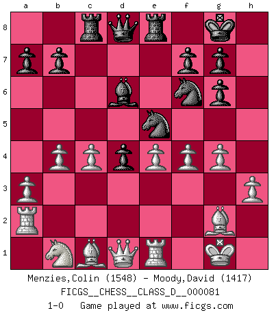 Last move : 1-0 2008 March 23 3:0:54 [Event "FICGS__CHESS__CLASS_D__000081"] [Site "FICGS"] [Date "2008.03.02"] [Round "1"] [White "Menzies,Colin"] [Black "Moody,David"] [Result "1-0"] [WhiteElo "1548"] [BlackElo "1417"] 1.Nf3 c5 2.g3 d5 3.Bg2 Nf6 4.c4 d4 5.e3 Nc6 6.exd4 cxd4 7.d3 e5 8.O-O Bd6 9.a3 O-O 10.b4 Re8 11.Re1 Bg4 12.h3 Bh5 13.g4 Bg6 14.Nh4 Rc8 15.Nxg6 hxg6 16.Ra2 e4 17.dxe4 Ne5 18.f4 1-0 Reti Opening Kingside Castling by player White (move 8) Kingside Castling by player Black (move 9) Player White won this chess game. Follow this game move after move (download)The isolated Pawn casts gloom over the entire chessboard. (Aaron Nimzovich) Ich hatte Angst gegen einen russischen Großmeister zu verlieren, und er befürchtete gegen einen kleinen Jungen zu verlieren. (über ein Remis gegen Juri Awerbach). (Robert James Fischer) Puntos débiles o agujeros en la posición de tu oponente deben de ser ocupados por piezas, no Peones. (Siegbert Tarrasch) Si le désir cupide (et stupide) de gagner est une inépuisable source de souffrance, une combinaison brillante sur l'échiquier est une découverte : le coquelicot qui s'épanouit lorsque apparaît la Voie Lactée. (Arrabal) I've lost money so fast in these clubs it's left me reeling. I've read every poker book ever written, but the only way to get better at the game is to go out and play with people who are really good. The problem is, you stand to lose a lot of money doing it. (Matt Damon)
