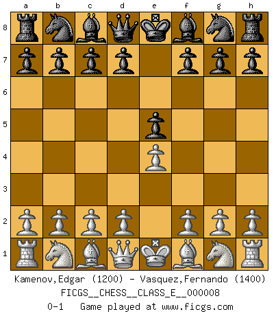 Last move : 0-1 2006 August 23 6:32:3 [Event "FICGS__CHESS__CLASS_E__000008"] [Site "FICGS"] [Date "2006.07.06"] [Round "1"] [White "Kamenov,Edgar"] [Black "Vasquez,Fernando"] [Result "0-1"] [WhiteElo "1200"] [BlackElo "1400"] 1.e4 e5 0-1 This chess game has been lost on time (started : 2006.07.06 21:19:30) King's pawn game Player Black won this chess game. Follow this game move after move (download)Only sissies Castle. (Rob Sillars) Wenn Du absolut nicht mehr weißt, was Du tun sollst, dann ist es Zeit für Panik. (John van der Wiel) Debemos de asegurarnos de que el Ajedrez no se convierta en un lenguaje muerto, muy interesante, pero tan solo para un grupo muy pequeño. (Sytze Faber) Si le désir cupide (et stupide) de gagner est une inépuisable source de souffrance, une combinaison brillante sur l'échiquier est une découverte : le coquelicot qui s'épanouit lorsque apparaît la Voie Lactée. (Arrabal) Always be a first-rate version of yourself, instead of a second-rate version of somebody else. (Judy Garland)