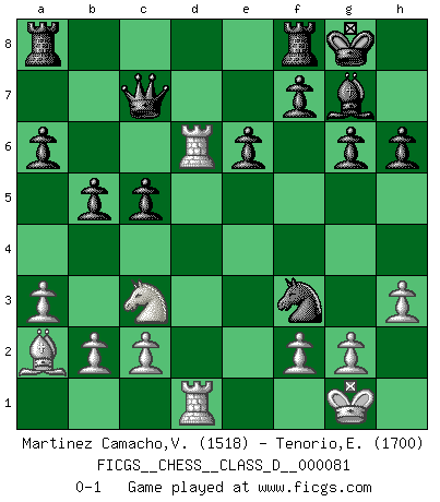 Last move : 0-1 2008 May 26 17:6:48 [Event "FICGS__CHESS__CLASS_D__000081"] [Site "FICGS"] [Date "2008.03.02"] [Round "1"] [White "Martinez Camacho,Victor Hugo"] [Black "Tenorio,Elizabeth"] [Result "0-1"] [WhiteElo "1518"] [BlackElo "1700"] 1.e4 d6 2.d4 Nd7 3.Nf3 g6 4.Bc4 Bg7 5.Be3 e6 6.O-O Ngf6 7.Nc3 O-O 8.Qd2 Ng4 9.h3 Nxe3 10.Qxe3 a6 11.a3 h6 12.Rfe1 b5 13.Ba2 c5 14.dxc5 dxc5 15.Rad1 Qc7 16.e5 Bb7 17.Rd6 Bxf3 18.Qxf3 Nxe5 19.Red1 Nxf3+ 0-1 King's pawn Opening Kingside Castling by player White (move 6) Kingside Castling by player Black (move 7) Player Black won this chess game. Follow this game move after move (download)Chess makes man wiser and clear-sighted. (Vladimir Putin) Ich glaube, ich kenne inzwischen die Gründe für mein Versagen: schachliche Charakterfehler. Ich war nie ein Wunderkind und in meiner gesamten menschlichen Entwicklung immer zu langsam. (Viktor Kortschnoi) El Ajedrez es de 30 a 40 por ciento psicología. Uno no cuenta con esto cuando se juega contra una computadora. No lo puedo confundir. (Judith Polgar) Shah mat. Le roi est mort. Cri de fierté d'un joueur venant de terrasser son adversaire, courtoisement, sans effusion de sang. This is where the fun begins. (Anakin Skywalker in Star Wars ep.3)