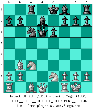 Last move : 1-0 2008 May 16 16:51:25 [Event "FICGS__CHESS__THEMATIC_TOURNAMENT__000046"] [Site "FICGS"] [Date "2008.03.03"] [Round "1"] [White "Imbeck,Ulrich"] [Black "Inving,Yugi"] [Result "1-0"] [WhiteElo "1310"] [BlackElo "1280"] 1.e4 c6 2.d4 d5 3.exd5 cxd5 4.c4 Nc6 5.cxd5 Qxd5 6.Nf3 Nf6 7.Nc3 Qd6 8.d5 Nb4 9.Bc4 Bf5 10.Nd4 Bd7 11.Nde2 Rc8 12.Bb3 Nfxd5 13.Nxd5 Nc6 14.O-O e6 15.Ndc3 1-0 Comment by player 1 : Ulrich Imbeck : Hello! Caro-Kann : Panov-Botvinnik attack Kingside Castling by player White (move 14) Player White won this chess game. Follow this game move after move (download)Live, lose, and learn, by observing your opponent how to win. (Amber Steenbock) Schach ist mein Leben, meine Leidenschaft, was ich gelernt habe und seit meinem 14. Lebensjahr profimässig praktiziere. Darauf zu verzichten, würde mir sehr schwer fallen. (Viktor Kortschnoi) El Ajedrez es la vida. (Bobby Fischer) En blitz, le Cavalier l'emporte sur le Fou. (Vlastimil Hort) Success without honor is an unseasoned dish; it will satisfy your hunger, but it won't taste good. (Joe Paterno)