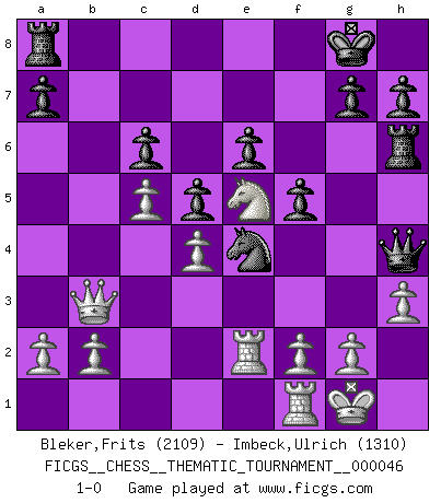 Last move : 1-0 2008 July 23 15:44:21 [Event "FICGS__CHESS__THEMATIC_TOURNAMENT__000046"] [Site "FICGS"] [Date "2008.03.03"] [Round "1"] [White "Bleker,Frits"] [Black "Imbeck,Ulrich"] [Result "1-0"] [WhiteElo "2109"] [BlackElo "1310"] 1.e4 c6 2.d4 d5 3.exd5 cxd5 4.c4 Nf6 5.Nc3 Nc6 6.Bg5 e6 7.Nf3 Be7 8.c5 O-O 9.Bb5 Ne4 10.Bxe7 Nxe7 11.Rc1 Bd7 12.Bd3 f5 13.O-O Nc6 14.Bb5 Rf6 15.Bxc6 bxc6 16.Ne2 Rh6 17.Ne5 Qh4 18.h3 Be8 19.Qb3 Bh5 20.Rc2 Bxe2 21.Rxe2 1-0 Caro-Kann : Panov-Botvinnik, normal variation Kingside Castling by player Black (move 8) Kingside Castling by player White (move 13) Player White won this chess game. Follow this game move after move (download)Combinations have always been the most intriguing aspect of Chess. The masters look for them, the public applauds them, the critics praise them. It is because combinations are possible that Chess is more than a lifeless mathematical exercise. They are the poetry of the game; they are to Chess what melody is to music. They represent the triumph of mind over matter. (Reuben Fine) Was ist der Unterschied zwischen einem Strassenarbeiter und einem Schachspieler? --Der Schachspieler bewegt sich ab und zu. (Anonymous) La belleza de un movimiento no se refleja solo en su apariencia, sino en el pensamiento detrás de él. (Siegbert Tarrasch) Je ne suis pas le dernier à jouer lâchement des coups douteux pendant le zeïtnot de l'adversaire pour l'achever: en effet les coups qui font le plus peur sont ceux que l'on ne comprend pas. Je me fais souvent peur quand je joue. (Un professeur anonyme) It is not enough to be a good player... you must also play well. (Siegbert Tarrasch)