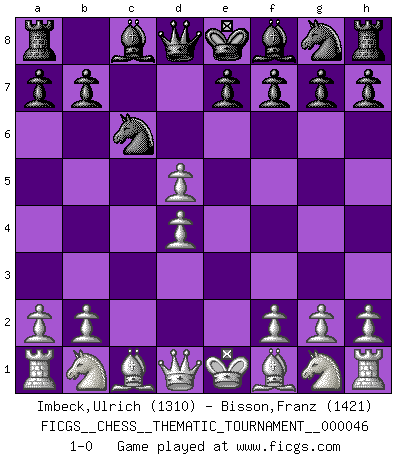 Last move : 1-0 2008 April 16 7:51:12 [Event "FICGS__CHESS__THEMATIC_TOURNAMENT__000046"] [Site "FICGS"] [Date "2008.03.03"] [Round "1"] [White "Imbeck,Ulrich"] [Black "Bisson,Franz"] [Result "1-0"] [WhiteElo "1310"] [BlackElo "1421"] 1.e4 c6 2.d4 d5 3.exd5 cxd5 4.c4 Nc6 5.cxd5 1-0 This chess game has been lost on time (started : 2008.03.03 4:6:59) Caro-Kann : Panov-Botvinnik attack Player White won this chess game. Follow this game move after move (download)By playing at Chess then, we may learn: First: Foresight... Second: Circumspection... Third: Caution... And lastly, we learn by Chess the habit of not being discouraged by present bad appearances in the state of our affairs, the habit of hoping for a favorable chance, and that of persevering in the secrets of resources. (Benjamin Franklin) Ich hatte Zahnschmerzen im ersten Spiel. In der zweiten Partie tat mir der Kopf weh. In der dritten war es eine Rheuma-Attacke und während der vierten fühlte ich mich nicht gut. Und in der fünften? Nun, man muss doch nicht jedes Spiel gewinnen, oder? (Savielly Grigorievitsch Tartakower) Debes de llevar a tu oponente hacia un profundo y obscuro bosque donde 2+2=5, y el camino que conduce a la salida es suficientemente ancho para solamente uno. (Mikhail Tal) Shah mat. Le roi est mort. Cri de fierté d'un joueur venant de terrasser son adversaire, courtoisement, sans effusion de sang. May the force be with you. (Han Solo in Star Wars ep.4)