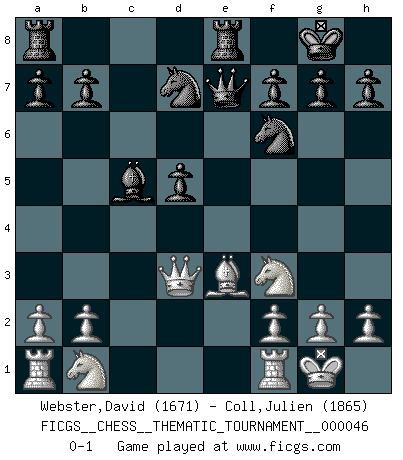 Last move : 0-1 2008 August 1 16:53:17 [Event "FICGS__CHESS__THEMATIC_TOURNAMENT__000046"] [Site "FICGS"] [Date "2008.03.03"] [Round "1"] [White "Webster,David"] [Black "Coll,Julien"] [Result "0-1"] [WhiteElo "1671"] [BlackElo "1865"] 1.e4 c6 2.d4 d5 3.exd5 cxd5 4.c4 Nf6 5.c5 e5 6.Bb5+ Bd7 7.Bxd7+ Nbxd7 8.Nf3 exd4 9.Qxd4 Bxc5 10.Qd3 Qe7+ 11.Be3 O-O 12.O-O Rfe8 0-1 Caro-Kann : Panov-Botvinnik, Gunderam attack Kingside Castling by player Black (move 11) Kingside Castling by player White (move 12) Player Black won this chess game. Follow this game move after move (download)Examine moves that smite! A good eye for smites is far more important than a knowledge of strategical principles. (Purdy) Karpov ist ein Museumsstück. (Garry Kasparov) Si tu oponente no puede hacer nada activo, entonces no apures la posición; En vez de eso, dejalo estar sentado ahí, sufriendo y rogandote por un empate. (Jeremy Silman) La tactique, c'est ce que vous faites quand il y a quelque chose à faire; la stratégie, c'est ce que vous faites quand il n'y a rien à faire. (Savielli Tartacower) If you ain't just a little scared when you enter a casino, you are either very rich or you haven't studied the games enough. (Pappy)