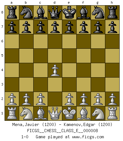 Last move : 1-0 2006 August 16 6:0:19 [Event "FICGS__CHESS__CLASS_E__000008"] [Site "FICGS"] [Date "2006.07.06"] [Round "1"] [White "Mena,Javier"] [Black "Kamenov,Edgar"] [Result "1-0"] [WhiteElo "1200"] [BlackElo "1200"] 1.d4 1-0 This chess game has been lost on time (started : 2006.07.06 21:19:30) Queen's pawn Player White won this chess game. Follow this game move after move (download)Let the perfectionist play postal. (Yasser Seirawan) Capablanka war das größte Genie der Schachgeschichte! Aber denken sie nicht er habe nichts vom Schach verstanden. Er wusste nur soviel wie er wissen musste um seine Ziele zu erreichen. (Mikhail Moiseyevich Botvinik) El Ajedrez es sobre todo, ¡una pelea!. (Emanuel Lasker) Aidez vos pièces, elles vous aideront. (Paul Morphy) Some people are so afraid to die that they never begin to live. (Henry Van Dyke)