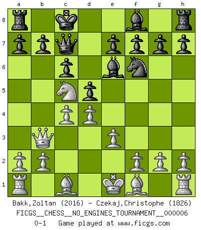 Last move : 0-1 2008 June 25 13:22:22 [Event "FICGS__CHESS__NO_ENGINES_TOURNAMENT__000006"] [Site "FICGS"] [Date "2008.03.08"] [Round "1"] [White "Bakk,Zoltan"] [Black "Czekaj,Christophe"] [Result "0-1"] [WhiteElo "2016"] [BlackElo "1826"] 1.d4 Nf6 2.Nf3 d5 3.c4 c6 4.e3 Bg4 5.Qb3 Qb6 6.Ne5 Be6 7.Nc3 Nbd7 8.Nxd7 Kxd7 9.Na4 Qc7 10.Nc5+ Kc8 0-1 This chess game has been lost on time (started : 2008.03.08 14:23:13) Queen's pawn game Player Black won this chess game. Follow this game move after move (download)In Chess, just as in life, today's bliss may be tomorrow's poison. (Assaic) Es gibt keine einzige Frau, der ich nicht einen Springer vorgeben könnte und trotzdem gewänne. (Robert James Fischer) El juego de Damas es para vagabundos. (Paul Morphy) Les Echecs ont trois composantes : le temps, l'espace et le matériel en dernier. (Mikhail Tal) Luck has a peculiar habit of favoring those who don't depend on it. (Author unknown)
