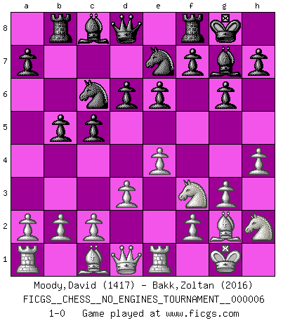 Last move : 1-0 2008 June 9 11:55:17 [Event "FICGS__CHESS__NO_ENGINES_TOURNAMENT__000006"] [Site "FICGS"] [Date "2008.03.08"] [Round "1"] [White "Moody,David"] [Black "Bakk,Zoltan"] [Result "1-0"] [WhiteElo "1417"] [BlackElo "2016"] 1.e4 c5 2.Nf3 e6 3.d3 Nc6 4.g3 g6 5.Bg2 Bg7 6.O-O Nge7 7.Nbd2 O-O 8.Re1 d6 9.Nf1 Rb8 10.h4 b5 11.N1h2 1-0 This chess game has been lost on time (started : 2008.03.08 14:23:13) Sicilian defense Kingside Castling by player White (move 6) Kingside Castling by player Black (move 7) Player White won this chess game. Follow this game move after move (download)No price is too great for the scalp of the enemy King. (Koblentz) Zu meiner Zeit war ein 20 jähriger ein junger Spieler, heute ist er ein Veteran. (Garry Kasparov) El Ajedrez, como cualquier otra actividad creativa, puede existir solo a través de méritos combinados de aquellos que tienen talento creativo y de aquellos que tienen la habilidad de organizar un trabajo creativo. (Mikhail Botvinnik) Je fais ceci parce que dans cinquante coups j'obtiendrai cela; je m'appelle Mikhail Moisevitch Botvinnik. (Botvinnik) All men can see these tactics whereby I conquer, but what none can see is the strategy out of which victory is evolved. (Sun Tzu)