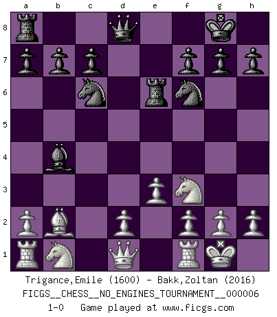 Last move : 1-0 2008 June 10 11:56:58 [Event "FICGS__CHESS__NO_ENGINES_TOURNAMENT__000006"] [Site "FICGS"] [Date "2008.03.08"] [Round "1"] [White "Trigance,Emile"] [Black "Bakk,Zoltan"] [Result "1-0"] [WhiteElo "1600"] [BlackElo "2016"] 1.b4 e5 2.Bb2 Bxb4 3.Bxe5 Nf6 4.c4 O-O 5.e3 d5 6.Nf3 Re8 7.Be2 dxc4 8.Bxc4 Nc6 9.Bb2 Be6 10.Bxe6 Rxe6 11.O-O 1-0 Polish (Sokolsky) opening Kingside Castling by player Black (move 4) Kingside Castling by player White (move 11) Player White won this chess game. Follow this game move after move (download)Chess is a terrible game. If you have no center, your opponent has a freer position. If you do have a center, then you really have something to worry about ! (Siegbert Tarrasch) Ohne Leiden bildet sich kein Charakter. (Ernst Freiherr von Feuchtersleben) Nunca antes ha habido un jugador de Ajedrez con tal conocimiento a fondo de las complejidades del juego y una inmensa voluntad absolutamente indomable de ganar. Yo pienso que Fischer es el jugador mas grande que jamás haya existido. (Lisa Lane) Il vaut mieux sacrifier les pièces de l'adversaire. (Xavier Tartacover) 98% of all statistics are made up. (Author unknown)