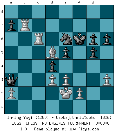 Last move : 1-0 2008 June 10 13:0:51 [Event "FICGS__CHESS__NO_ENGINES_TOURNAMENT__000006"] [Site "FICGS"] [Date "2008.03.08"] [Round "1"] [White "Inving,Yugi"] [Black "Czekaj,Christophe"] [Result "1-0"] [WhiteElo "1280"] [BlackElo "1826"] 1.g4 d5 2.Bg2 Bxg4 3.c4 c6 4.cxd5 cxd5 5.Nc3 Nf6 6.h3 Bh5 7.Qb3 e6 8.Qxb7 Nbd7 9.Nf3 Bc5 10.e3 O-O 11.Qb3 Rb8 12.Qc2 Bg6 13.d3 Qe7 14.Bd2 Rfc8 15.Rc1 h6 16.Rg1 e5 17.Nh4 d4 18.Nxg6 fxg6 19.Ne4 Nxe4 20.Bxe4 g5 21.Qc4+ Kh8 22.b4 Bxb4 23.Qxc8+ Rxc8 24.Rxc8+ Nf8 25.Bxb4 Qxb4+ 26.Ke2 g6 27.Rgc1 Kg7 28.R1c7+ Kf6 29.Rb7 Qa3 30.Rc6+ Ne6 31.Bd5 1-0 Grob : Fritz gambit Kingside Castling by player Black (move 10) Player White won this chess game. Follow this game move after move (download)You can only get good at Chess if you love the game. (Bobby Fischer) Schach ist ein Reich, wo sich die menschliche Phantasie frei entfalten kann. (David Bronstein) El Ajedrez, como la música, como el amor, tiene el poder de hacer feliz a la gente. (Siegbert Tarrasch) Aux échecs, l'amour-propre est satisfait quand on remporte la victoire, mais il n'y a pas de honte à être battu. (Benjamin Franklin) Wisdom doesn't necessarily come with age. Sometimes age just shows up all by itself. (Tom Wilson)
