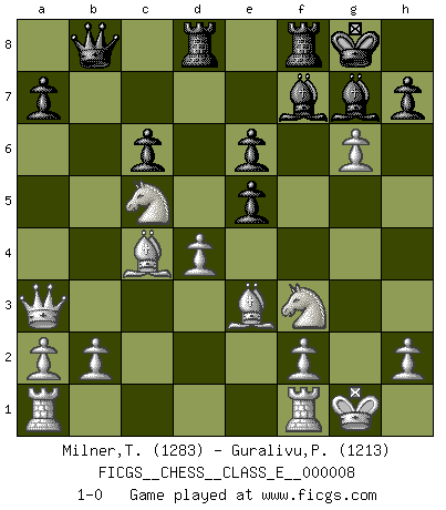 Last move : 1-0 2006 September 3 12:16:24 [Event "FICGS__CHESS__CLASS_E__000008"] [Site "FICGS"] [Date "2006.07.06"] [Round "1"] [White "Milner,Trevor"] [Black "Guralivu,Paul-Iosif"] [Result "1-0"] [WhiteElo "1283"] [BlackElo "1213"] 1.d4 Nf6 2.c4 d5 3.cxd5 Nxd5 4.Nf3 g6 5.e4 Nf6 6.Nc3 Bg7 7.Bb5+ Bd7 8.Qb3 c6 9.Bc4 O-O 10.Qxb7 Na6 11.Qxa6 Be8 12.O-O Nh5 13.Be3 Qb6 14.Qa3 e6 15.e5 Rd8 16.Na4 Qb8 17.g4 f6 18.gxh5 Bf7 19.Nc5 fxe5 20.hxg6 1-0 Queen's pawn game Kingside Castling by player Black (move 9) Kingside Castling by player White (move 12) Player White won this chess game. Follow this game move after move (download)The passed Pawn is a criminal, who should be kept under lock and key. Mild measures, such as police surveillance, are not sufficient. (Aaron Nimzovich) Kleine Schachspieler machen Mist, und große Schachspieler machen Mist, aber große machen weniger Mist. (Fritz Sämisch) Cuando veas una buena jugada, trata de encontrar otra mejor. (Emanuel Lasker) Le joueur d'Echecs qui veut atteindre le top est obligé de développer son propre credo créatif. Alexeï Stepanovicth Souétine. Il est facile d'écrire des livres ! Ce qui est difficile, c'est de jouer ! (Alexeï Stepanovicth Souétine) All war is based on deception. (Sun Tzu)