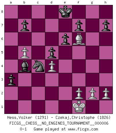 Last move : 0-1 2008 May 26 14:40:45 [Event "FICGS__CHESS__NO_ENGINES_TOURNAMENT__000006"] [Site "FICGS"] [Date "2008.03.08"] [Round "1"] [White "Hess,Volker"] [Black "Czekaj,Christophe"] [Result "0-1"] [WhiteElo "1291"] [BlackElo "1826"] 1.e4 Nf6 2.e5 Nd5 3.Nf3 d6 4.Bc4 Nb6 5.Bb3 Nc6 6.exd6 cxd6 7.Ng5 e6 8.Qf3 Qf6 9.Qxf6 gxf6 10.Nf3 Bd7 11.O-O a5 12.a4 Rc8 13.Nc3 d5 14.Nb5 Nb4 15.d3 Nxc2 16.Bxc2 Rxc2 17.Be3 Bc5 18.d4 Bb4 19.Rac1 Rxc1 20.Rxc1 Bxb5 21.axb5 Kd7 22.Bh6 Rg8 23.Bf4 Rc8 24.Kf1 Rxc1+ 25.Bxc1 a4 26.Bh6 Nc4 27.Bg7 Nxb2 28.Bxf6 a3 29.Ne5+ Ke8 30.Nc4 Nxc4 0-1 Alekhine's defense Kingside Castling by player White (move 11) Player Black won this chess game. Follow this game move after move (download)Chess is a beautiful mistress. (Bent Larsen) Ein Kibitz ist einer, der deinem Gegner gute Ratschläge gibt. (Andrew Soltis) No es una movida, aún la mejor movida que tu debas buscar, sino un plan comprensible. (Eugene Znosko-Borovsky) Mon pion favori sur ma case favorite ! Bronstein en parlant d'un coup de pion en h5 quand il avait les Noirs. Good luck. You're gonna need it. (Han Solo in Star Wars ep.6)
