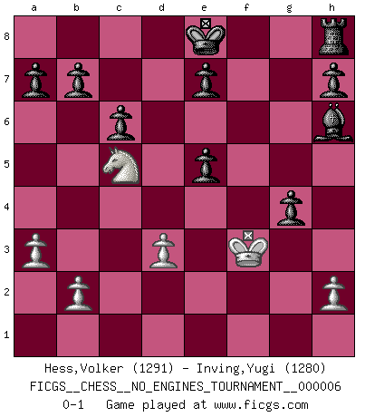 Last move : 0-1 2008 March 24 7:47:23 [Event "FICGS__CHESS__NO_ENGINES_TOURNAMENT__000006"] [Site "FICGS"] [Date "2008.03.08"] [Round "1"] [White "Hess,Volker"] [Black "Inving,Yugi"] [Result "0-1"] [WhiteElo "1291"] [BlackElo "1280"] 1.e4 c6 2.f4 Nf6 3.Nc3 d5 4.e5 Ne4 5.Nxe4 dxe4 6.d3 Bf5 7.Be2 Na6 8.dxe4 Bxe4 9.Nf3 Nb4 10.Qxd8+ Rxd8 11.Bd3 Bxd3 12.cxd3 Nc2+ 13.Ke2 Nxa1 14.Be3 Nc2 15.Rc1 Nxe3 16.Kxe3 f6 17.Nd4 Rd5 18.Ne6 Ra5 19.a3 fxe5 20.f5 g6 21.g4 gxf5 22.Rc5 Rxc5 23.Nxc5 Bh6+ 24.Kf3 fxg4+ 0-1 Caro-Kann defense Player Black won this chess game. Follow this game move after move (download)A bad plan is better than none at all. (Frank Marshall) Oft bringt ein stiller Zug das Erdbeben. (Richard Reti) El Ajedrez por encima de todo... ¡es una pelea!. (Emanuel Lasker) Un journaliste : 'Vous préférez avoir une dame de plus sur l'échiquier ou au lit ?' Boris Spassky : 'Ca dépend de la position.' For peace of mind, resign as general manager of the universe. (Douglas Adams)