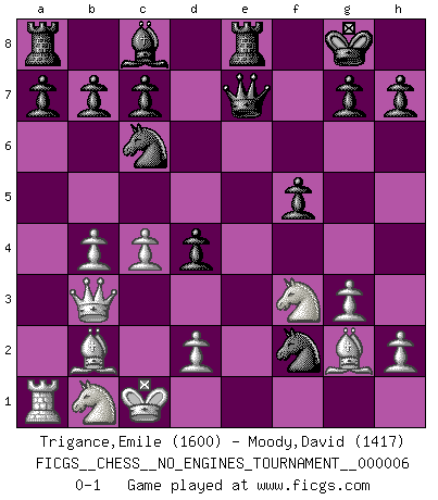 Last move : 0-1 2008 March 22 20:2:57 [Event "FICGS__CHESS__NO_ENGINES_TOURNAMENT__000006"] [Site "FICGS"] [Date "2008.03.08"] [Round "1"] [White "Trigance,Emile"] [Black "Moody,David"] [Result "0-1"] [WhiteElo "1600"] [BlackElo "1417"] 1.b4 f5 2.Bb2 e6 3.e4 Nf6 4.exf5 Bxb4 5.Qe2 O-O 6.Nf3 Re8 7.Qc4 Nc6 8.a3 d5 9.Qb3 exf5 10.Kd1 Ne4 11.axb4 Nxf2+ 12.Kc1 Nxh1 13.c4 d4 14.g3 Qe7 15.Bg2 Nf2 0-1 Polish (Sokolsky) opening Kingside Castling by player Black (move 5) Player Black won this chess game. Follow this game move after move (download)You sit at the board and suddenly your heart leaps. Your hand trembles to pick up the piece and move it. But what Chess teaches you is that you must sit there calmly and think about whether it's really a good idea and whether there are other better ideas. (Stanley Kubrick) Ich hatte Zahnschmerzen im ersten Spiel. In der zweiten Partie tat mir der Kopf weh. In der dritten war es eine Rheuma-Attacke und während der vierten fühlte ich mich nicht gut. Und in der fünften? Nun, man muss doch nicht jedes Spiel gewinnen, oder? (Savielly Grigorievitsch Tartakower) Debes de llevar a tu oponente hacia un profundo y obscuro bosque donde 2+2=5, y el camino que conduce a la salida es suficientemente ancho para solamente uno. (Mikhail Tal) Le génie consiste à savoir transgresser les règles au moment opportun. (Teichmann) I've lost money so fast in these clubs it's left me reeling. I've read every poker book ever written, but the only way to get better at the game is to go out and play with people who are really good. The problem is, you stand to lose a lot of money doing it. (Matt Damon)