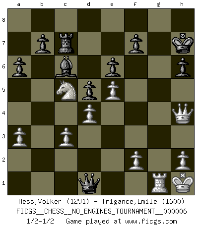 Last move : 1/2-1/2 2008 April 14 16:1:6 [Event "FICGS__CHESS__NO_ENGINES_TOURNAMENT__000006"] [Site "FICGS"] [Date "2008.03.08"] [Round "1"] [White "Hess,Volker"] [Black "Trigance,Emile"] [Result "1/2-1/2"] [WhiteElo "1291"] [BlackElo "1600"] 1.e4 e6 2.d4 d5 3.Nc3 Bb4 4.e5 c5 5.Nf3 Nc6 6.Bb5 Bd7 7.Bxc6 Bxc6 8.O-O Ne7 9.Ng5 h6 10.Nf3 Nf5 11.a3 Bxc3 12.bxc3 cxd4 13.cxd4 Qb6 14.c3 Rc8 15.Ne1 O-O 16.Nd3 Rc7 17.Nc5 a6 18.g4 Ne7 19.g5 Nf5 20.gxh6 Nxh6 21.Bxh6 gxh6 22.Qg4+ Kh7 23.Qh4 Qb2 24.Kh1 Qe2 25.Rg1 Qf3+ 26.Rg2 Rg8 27.Rag1 Rxg2 28.Rxg2 Qd1+ 29.Rg1 Qf3+ 30.Rg2 Qd1+ 31.Rg1 1/2-1/2 French : Winawer, Advance variation Kingside Castling by player White (move 8) Kingside Castling by player Black (move 15) This chess game ended in a draw. Follow this game move after move (download)I know people who have all the will in the world, but still can't play good Chess. (Bobby Fischer) Die Elozahlen sind sehr schlecht für das Schach. Jetzt ist Schach eine Sportindustrie, die darauf zielt Elopunkte zu machen. (Miguel Najdorf) Aquel que toma al Peón de Caballo de la Reina, se pasará la noche a dormir en la calle. (Anónimo) Même un GMI sait rarement calculer sur plus de cinq coups une attaque à sacrifices. (Rudolf Spielmann) This is where the fun begins. (Anakin Skywalker in Star Wars ep.3)