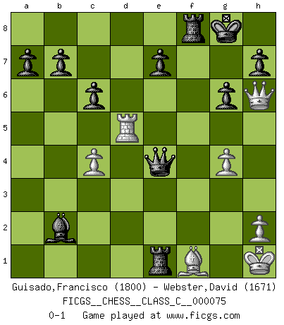 Last move : 0-1 2008 May 25 23:10:40 [Event "FICGS__CHESS__CLASS_C__000075"] [Site "FICGS"] [Date "2008.03.08"] [Round "1"] [White "Guisado,Francisco"] [Black "Webster,David"] [Result "0-1"] [WhiteElo "1800"] [BlackElo "1671"] 1.d4 Nf6 2.c4 g6 3.Nc3 c5 4.Nf3 cxd4 5.Nxd4 Nc6 6.g3 Bg7 7.Be3 O-O 8.Bg2 Ng4 9.Nxc6 dxc6 10.Qc1 Nxe3 11.Qxe3 Be6 12.b3 Bd4 13.Qd3 Bf5 14.Qf3 Be4 15.Nxe4 Qa5+ 16.Nd2 Bxa1 17.O-O Qxa2 18.Ne4 Bd4 19.g4 Rad8 20.Ng5 Qd2 21.Qh3 Qxg5 22.e3 Bb2 23.f4 Qc5 24.f5 Rd3 25.Kh1 Rxb3 26.fxg6 fxg6 27.Rd1 Rxe3 28.Qh6 Qe5 29.Rd5 Re1+ 30.Bf1 Qe4+ 0-1 King's Indian defense, 3.Nc3 Kingside Castling by player Black (move 7) Kingside Castling by player White (move 17) Player Black won this chess game. Follow this game move after move (download)In order to improve your game, you must study the endgame before everything else, for whereas the endings can be studied and mastered by themselves, the middle game and the opening must be studied in relation to the endgame. (Jose Raul Capablanca) Am wohlsten fühle ich mich, wenn ich sehe, wie sich mein Gegner im Todeskampf windet. (Robert James Fischer) Un entendimiento minucioso de las típicas continuaciones de mate hacen de las mas complicadas combinaciones de sacrificio que conducen hacia ellas no solo no dificiles, sino casi un asunto de rutina. (Siegbert Tarrasch) Je ne crois pas en la psychologie, je crois aux bons coups. (Robert Fischer) Control your own destiny or someone else will. (Jack Welch)