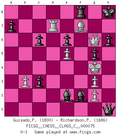 Last move : 0-1 2008 April 21 23:56:24 [Event "FICGS__CHESS__CLASS_C__000075"] [Site "FICGS"] [Date "2008.03.08"] [Round "1"] [White "Guisado,Francisco"] [Black "Richardson,Patrick"] [Result "0-1"] [WhiteElo "1800"] [BlackElo "1686"] 1.d4 d5 2.c4 c6 3.Nf3 Nf6 4.Nc3 e6 5.Bg5 h6 6.Bh4 dxc4 7.e4 g5 8.Bg3 b5 9.Be2 Bb7 10.O-O Nbd7 11.Qc2 Nh5 12.Ne5 Nxg3 13.hxg3 Nxe5 14.dxe5 Bg7 15.Rad1 Qb6 16.Bh5 Bxe5 17.b3 O-O 18.Rd7 Rad8 19.Rfd1 Rxd7 20.Rxd7 Bc8 21.Rd1 cxb3 22.axb3 Qc5 23.Rd3 b4 24.Qd1 bxc3 25.Qc2 Ba6 26.Rd7 Bd4 27.e5 Bxf2+ 28.Kh1 Qe3 29.Bxf7+ Kh8 30.Qg6 Qe1+ 31.Kh2 Qg1+ 32.Kh3 Qh1+ 33.Kg4 Be2+ 0-1 QGD Slav : 4.Nc3 Kingside Castling by player White (move 10) Kingside Castling by player Black (move 17) Player Black won this chess game. Follow this game move after move (download)When asked, -How is that you pick better moves than your opponents?, I responded: I'm very glad you asked me that, because, as it happens, there is a very simple answer. I think up my own moves, and I make my opponent think up his. (Alexander Alekhine) Kritik überlasse ich den Spießern. Ich zeige nichts, wofür ich mich schämen muss. (Alexandra Kosteniuk) Coloca el contenido del tablero de Ajedrez en un sombrero, agita las piezas vigorosamente, derrámalas en el tablero desde una altura de medio metro y así obtienes el estilo de Wilhelm Steinitz. (H. E. Bird) Il vaut mieux sacrifier les pièces de l'adversaire. (Xavier Tartacover) Always remember that you are unique; just like everyone else. (Unknown)