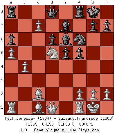 Last move : 1-0 2008 September 30 22:35:27 [Event "FICGS__CHESS__CLASS_C__000075"] [Site "FICGS"] [Date "2008.03.08"] [Round "1"] [White "Pech,Jaroslav"] [Black "Guisado,Francisco"] [Result "1-0"] [WhiteElo "1734"] [BlackElo "1800"] 1.e4 c5 2.Nf3 Nc6 3.d4 cxd4 4.Nxd4 Nf6 5.Nc3 e5 6.Ndb5 d6 7.Nd5 Nxd5 8.exd5 Nb8 9.c4 a6 10.Nc3 Be7 11.Bd3 Nd7 12.O-O Nc5 13.Bc2 O-O 14.b4 Nd7 15.c5 f5 16.c6 Nb6 17.a4 bxc6 18.a5 Nd7 19.dxc6 Nf6 20.Nd5 Be6 21.c7 1-0 Sicilian : Pelikan (Lasker/Sveshnikov) variation Kingside Castling by player White (move 12) Kingside Castling by player Black (move 13) Player White won this chess game. Follow this game move after move (download)Bobby is the finest Chess player this country ever produced. His memory for the moves, his brilliance in dreaming up combinations, and his fierce determination to win are uncanny. (John Collins) Nur ein wirklich starker Spieler weiß wie schwach er spielt. (Savielly Grigorievitsch Tartakower) El Ajedrez es parte de la cultura, y si una cultura esta en decadencia, entonces también el Ajedrez declinará. (Mikhail Botvinnik) Les Echecs mettent en conflit, non pas deux intelligences, mais deux volontés. (Lasker) Memory is a crazy woman that hoards colored rags and throws away food. (Austin O'Malley)