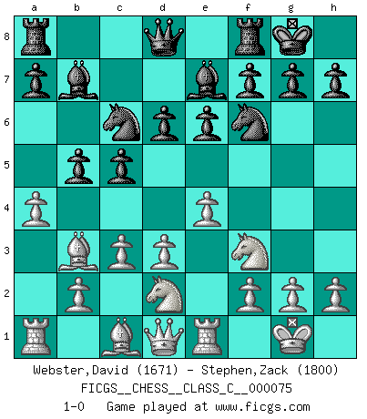 Last move : 1-0 2008 May 18 22:13:15 [Event "FICGS__CHESS__CLASS_C__000075"] [Site "FICGS"] [Date "2008.03.08"] [Round "1"] [White "Webster,David"] [Black "Stephen,Zack"] [Result "1-0"] [WhiteElo "1671"] [BlackElo "1800"] 1.e4 c5 2.Nf3 d6 3.Bc4 Nf6 4.d3 Nc6 5.O-O e6 6.Bb3 Be7 7.c3 O-O 8.Re1 b5 9.Nbd2 Bb7 10.a4 1-0 This chess game has been lost on time (started : 2008.03.08 18:15:36) Sicilian Kingside Castling by player White (move 5) Kingside Castling by player Black (move 7) Player White won this chess game. Follow this game move after move (download)First-class players lose to second class players because second-class players sometimes play a first-class game. (Tarrasch) Die FIDE ist dabei in die Hände der russischen Mafia zu fallen. (Larry Evans) Con o sin el título, Bobby Fischer fue sin lugar a dudas el mas grande jugador de su época. (Burt Hochberg) Mon pion favori sur ma case favorite ! Bronstein en parlant d'un coup de pion en h5 quand il avait les Noirs. Perseverance does not equal worthiness. Next time you want to get my attention, wear something fun. Low-riding jeans are hot. (Gregory House, House M.D.)