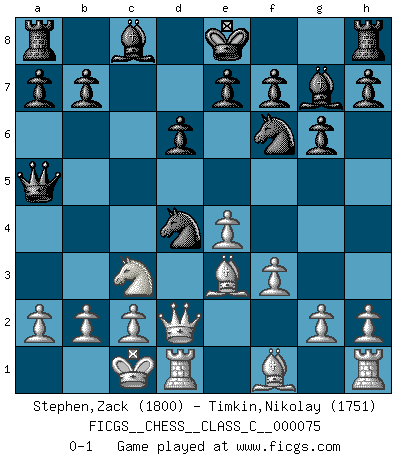 Last move : 0-1 2008 May 21 22:25:9 [Event "FICGS__CHESS__CLASS_C__000075"] [Site "FICGS"] [Date "2008.03.08"] [Round "1"] [White "Stephen,Zack"] [Black "Timkin,Nikolay"] [Result "0-1"] [WhiteElo "1800"] [BlackElo "1751"] 1.e4 c5 2.Nf3 d6 3.d4 cxd4 4.Nxd4 Nf6 5.Nc3 g6 6.Be3 Bg7 7.f3 Nc6 8.Qd2 Qa5 9.O-O-O Nxd4 0-1 This chess game has been lost on time (started : 2008.03.08 18:15:36) Sicilian : Dragon, Yugoslav attack Queenside Castling by player White (move 9) Player Black won this chess game. Follow this game move after move (download)Chess problems demand from the composer the same virtues that characterize all worthwhile art: originality, invention, conciseness, harmony, complexity, and splendid insincerity. (Vladimir Nabokov) Jeder weiß, dass Gasprom Putins persönliches Machtinstrument ist. Die Firma wird vom Kreml aus geleitet und wird schon deshalb nie transparent sein. (Garry Kasparov) En partidas rápidas, el Caballo es mas poderoso que el Alfil. (Vlastimil Hort) Votre seul travail dans les ouvertures est d'obtenir un milieu de partie jouable. (Lajos Portish) Unless in communicating with it one says exactly what one means, trouble is bound to result. (Alan Turing, about computers)